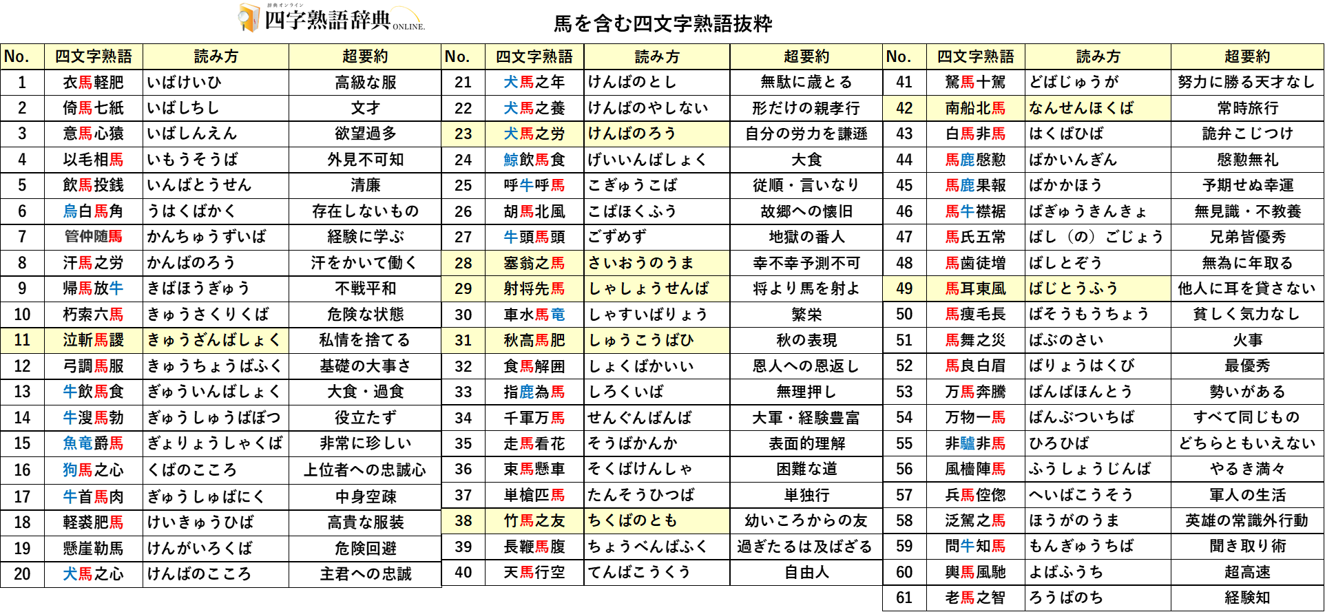 「馬」を含む四字熟語は非常に多く、如何に馬が人間の生活の中に登場するかを窺い知ることができます。「すばらしい」ものの喩えから「役にたたない」ものの喩えまで、非常に幅広い意味合いで使用されていました。まずは、検索ででてきた77のうち重複等を除いてピックアップした61の四字熟語と読み方、超要約(小職の独断で要約したもの)の一覧表を示します。