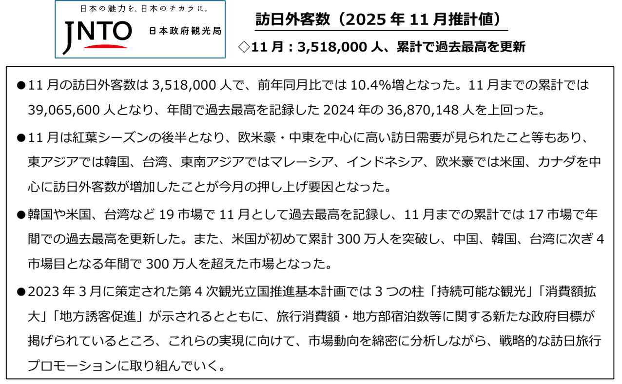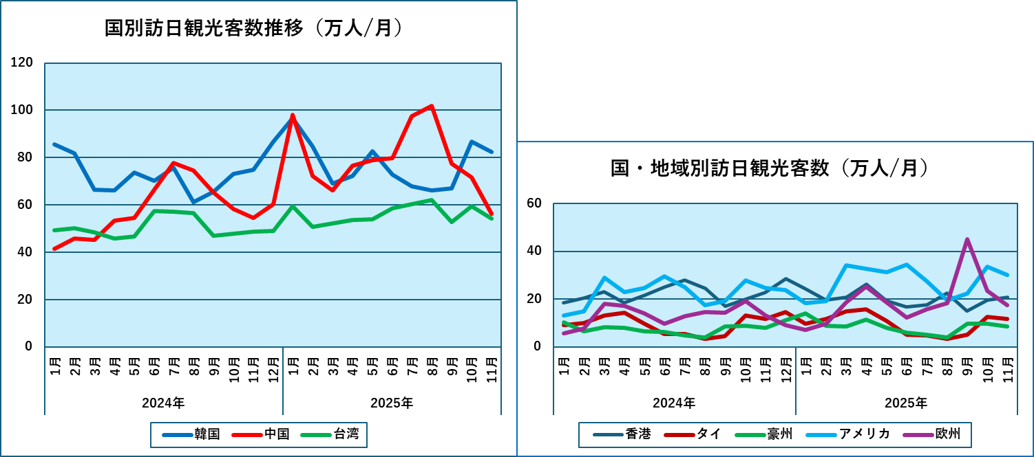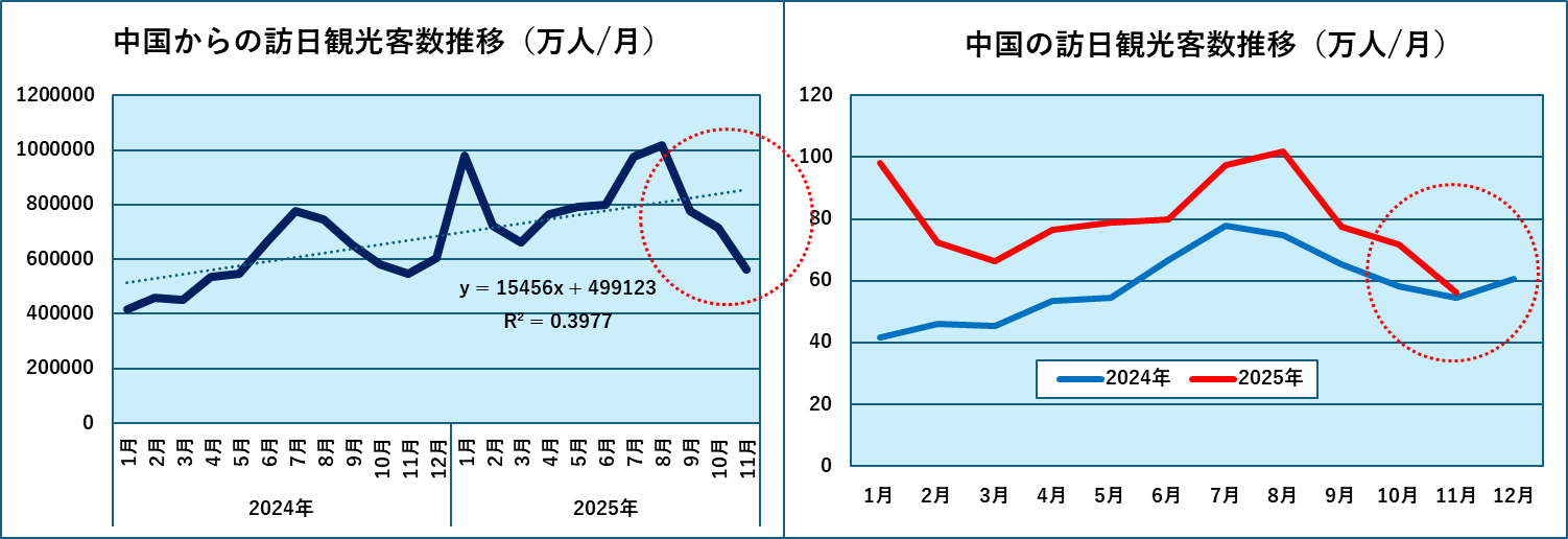 2025年は8月で過去最高の100万人超えを記録したあと9月10月11月と3カ月連続で減少していますが、これは万博の影響もあるのではないかとも思われます。また、右図で11月でさえ辛うじて前年超えですので、中国政府の渡航自粛勧告の影響については、12月の統計にどう表れるか注目していきたいと思います。