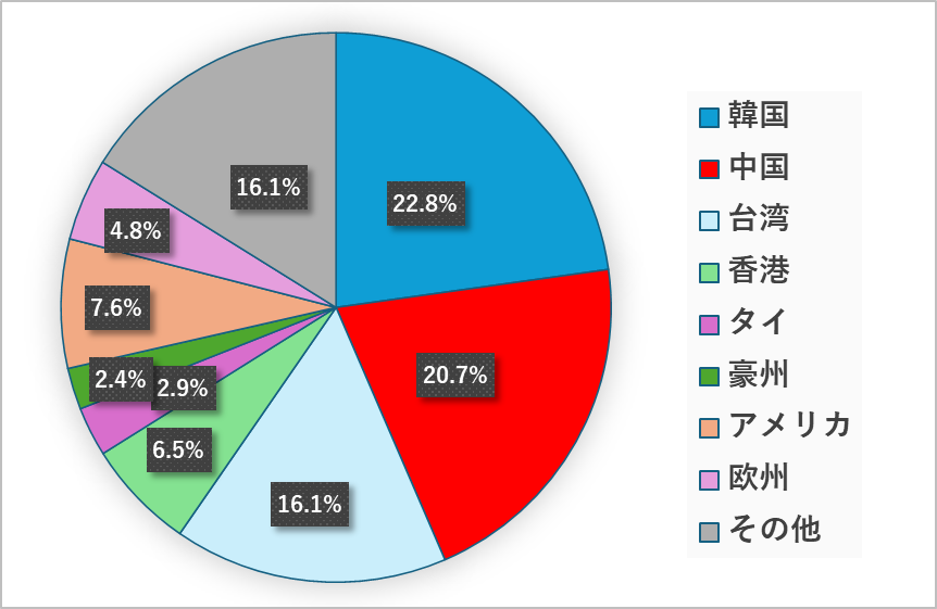 2024年1月以降2025年までの累計による国・地域別の内訳は下図のようになります。中国からは20.7%、香港も加えると27.5%を占めます。少なからぬ割合ですが、今年の総累計予想4300万人から中国と香港の予想総数を差し引いても残りは3000万人強になります。わずか2年前の2023年の累計総数が25000万人でしたので、それは優に上回ります。いずれにせよテレビのニュースで報道されているほどには、訪日客は激減していないのではないかという印象を持ちます。今後の統計に注目したいと思います。
