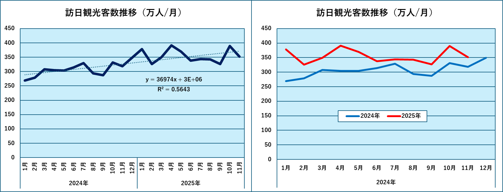 訪日観光客自体は増加傾向にあり、2025年は過去最高を記録することは確定で初の累計4000万人越えとなることも確定です。また右図で示すように2025年各月はすべて2024年を上回りました。