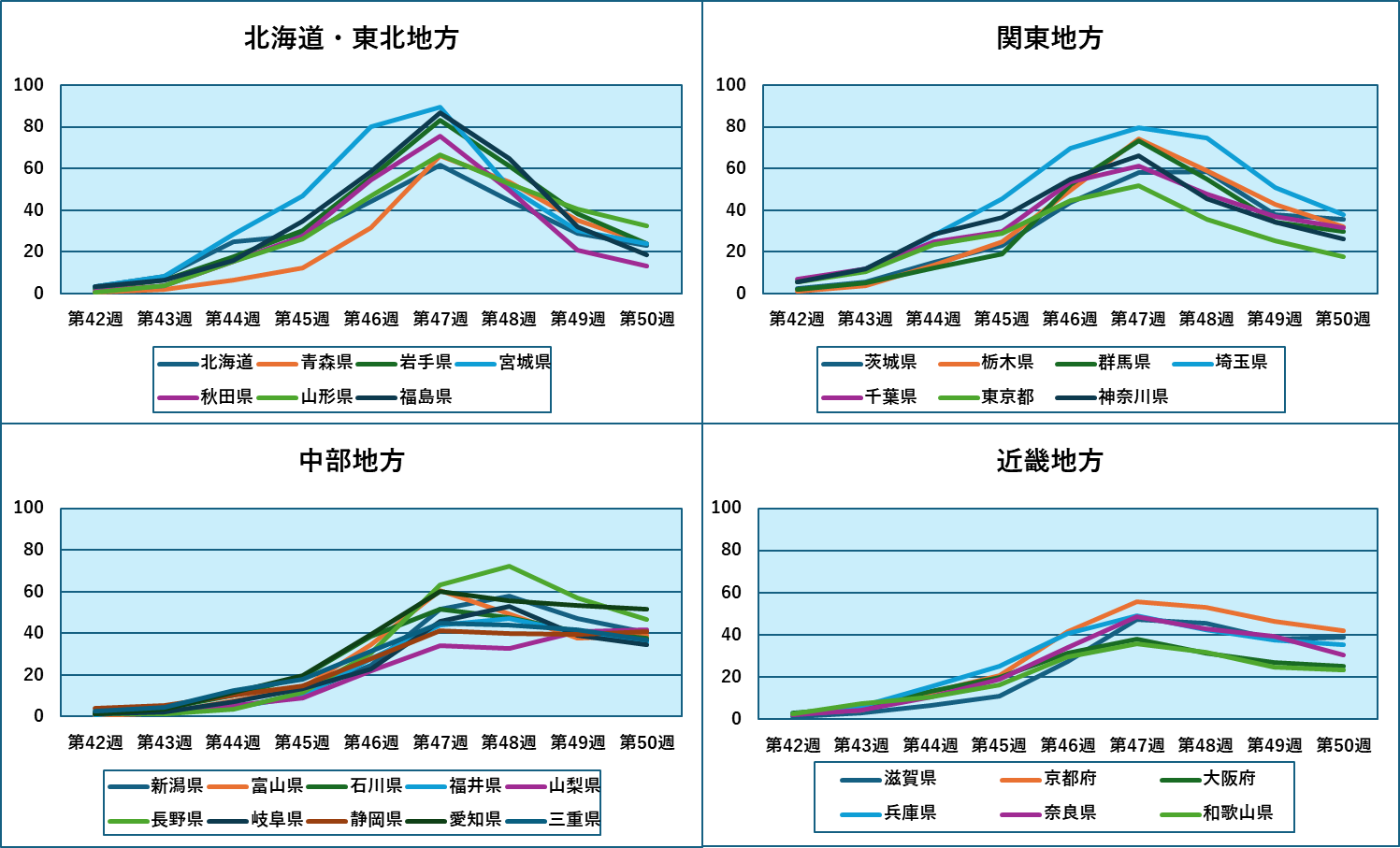 中国・四国、および九州地方では、定点あたり感染者数が50を超える県も多く、そろそろ収束に向かう時期ではないかと推測しています。なんとか年内に全国的な収束に至ってほしいと思っております。