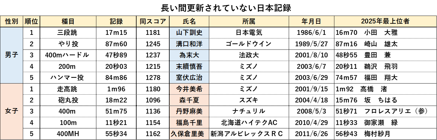 最後に「長い間更新されていない日本記録」を男女5つずつご紹介します。このうち9つは昨年と変わらずで、未更新期間がそれぞれ1年ずつ伸びました。唯一更新されたのが、上でご紹介した女子3000m障害の早狩さんの2008年の記録でした。これに代わり今年は、2011年の400mハードル久保倉さんの記録が載っています。これらの中でも最も古い記録は男子三段跳びの山下選手の来年で40年前の記録となります。
