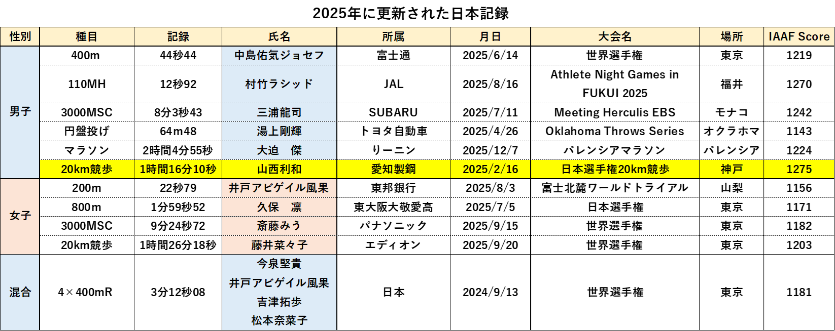 今年はまだ記憶が新しい世界選手権日本開催がありました。その世界選手権で日本記録が4つ更新されました。実はこうした世界選手権のような大きな大会で日本記録が更新されるのはそうあることではありません。現在の日本記録のういち、これまでのオリンピックまたは世界選手権で更新された日本記録はリレーを除くと男子400Mハードル(為末大選手)と女子1500m(田中希美選手)の二つしかありません。今回の世界選手権東京大会では男子400m、女子3000m障害、女子20Km競歩、男女混合4X400mリレーの4つの日本新記録が生まれました。地元開催というアドバンテージはあったにせよ称賛されるべきことと思います。前置きが長くなりましたが、今年更新された日本記録の一覧表をご覧ください。