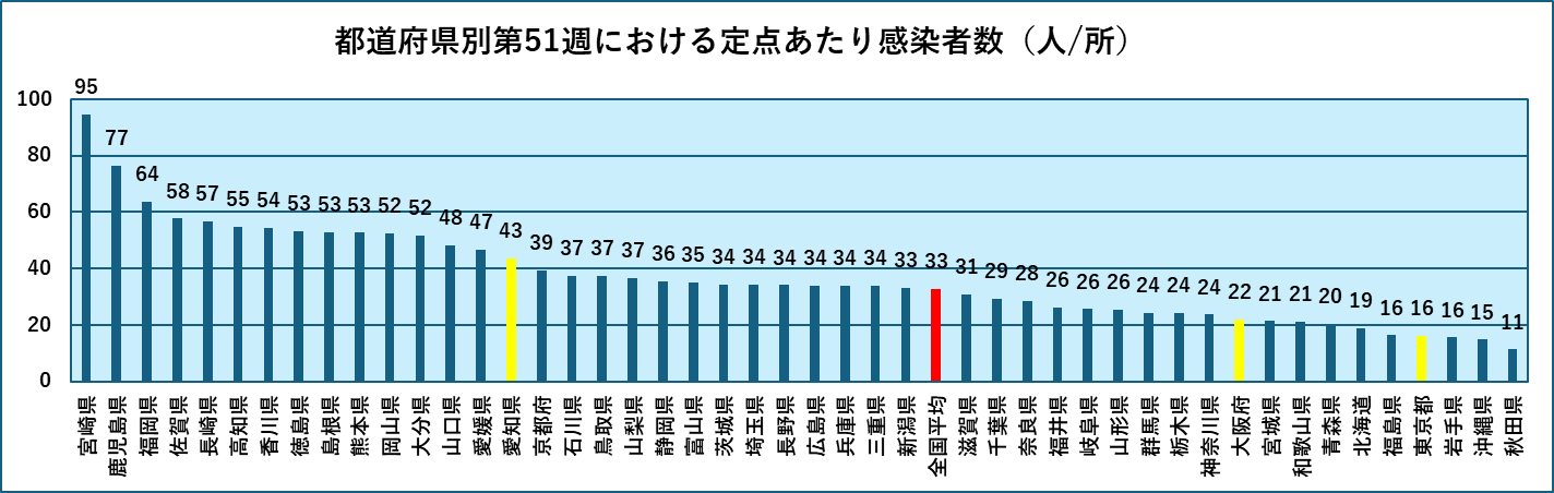これまでの傾向として定点あたり感染者数が50を超えると1~2週で減少に転じる場合が多いのですが、鹿児島県では70以上が2週、徳島県は50以上が2週続きました。さらに感染が爆発的なのが宮崎県で、第49週から62.54 ➡ 99.93 ➡ 94.75と驚異的な感染者数となっています。
