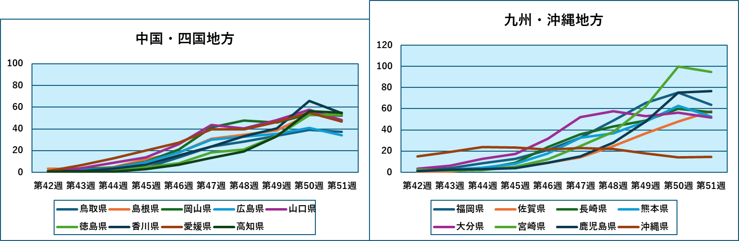 北海道から近畿までは、第47週がピークで4週連続の減少です。一方中国・四国と九州・沖縄では過半数が第50週がピークで、まだ増加が続いている県もあります。