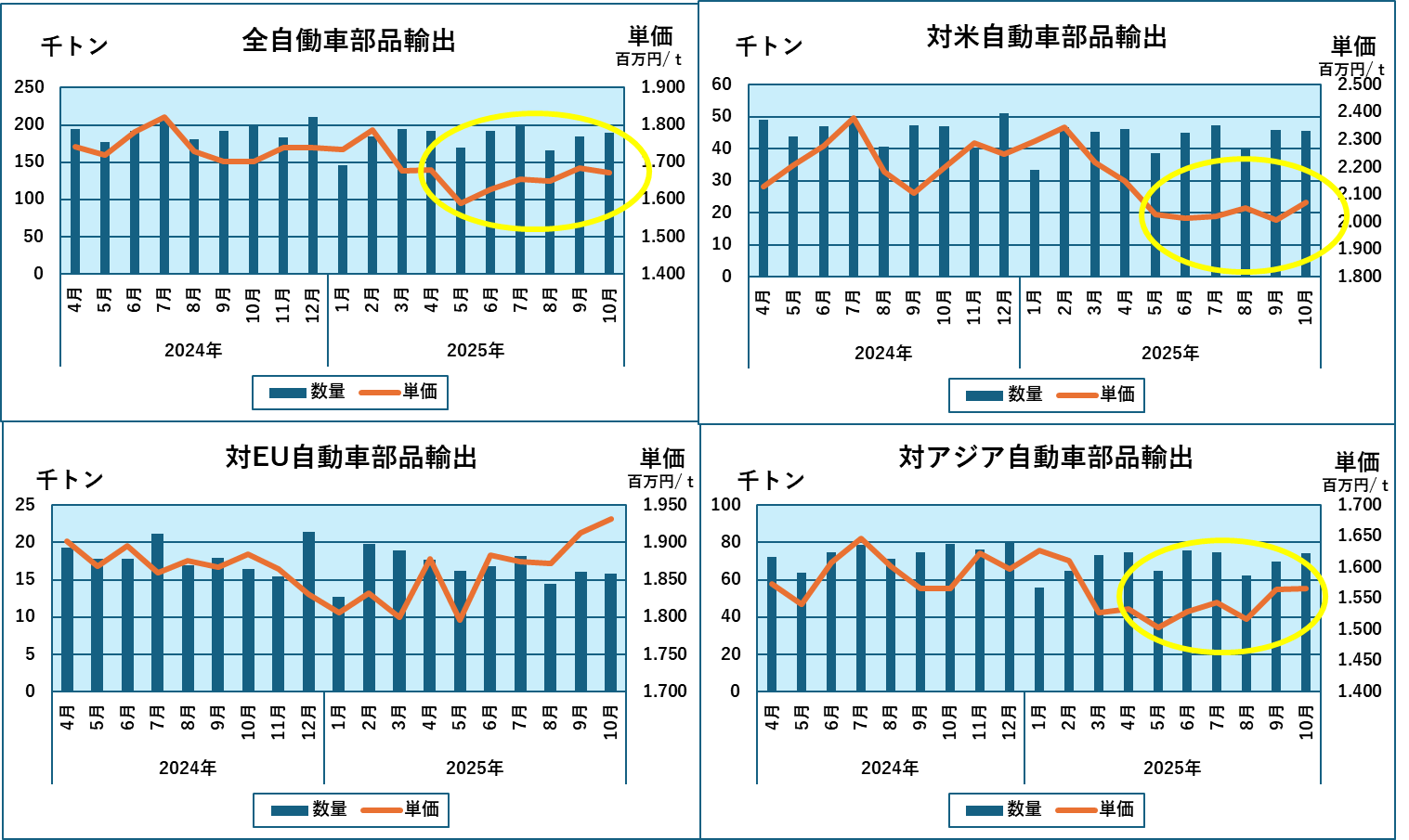 一方、対EU、対アジアではそうした傾向は認められません。2025年における対米自動車輸出の単価低迷は、対米輸出特有な現象であこことは明らかです。