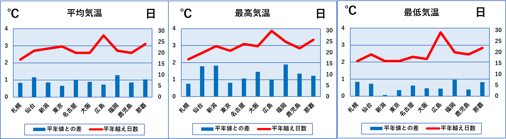 また、全国的な傾向としては、西日本の方が平年値超え日数が多いものの、平年値との気温差の数値は明確な傾向を示しませんでした。(下図)