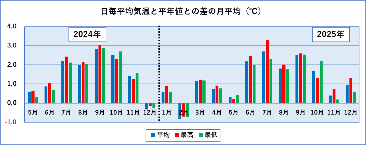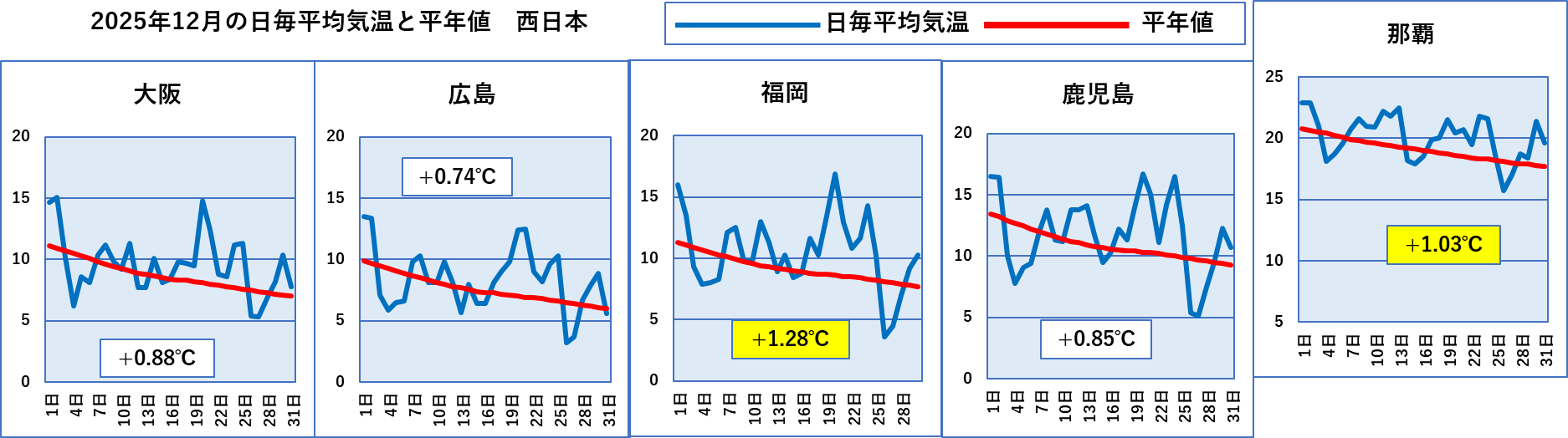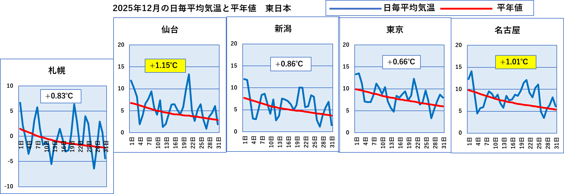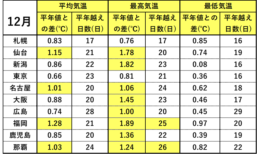 12月の気温は、小幅ではありますが、主要10都市すべてで平年値を超え、これで平年値超えが10か月連続となりました。