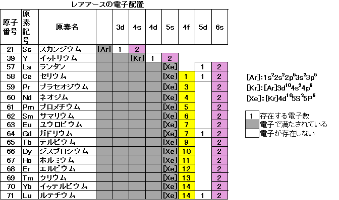 最後に、少し技術的な話をしたいと思います。どうして希土類(レアアース)がこのように有用性が高いのかということです。その答えはレアアースの電子配置にあります。電子配置とは電子がどの軌道に何個配置されているかということで、原子の設計図のようなものだと考えてください。レアアースの電子配置を下表に示します。