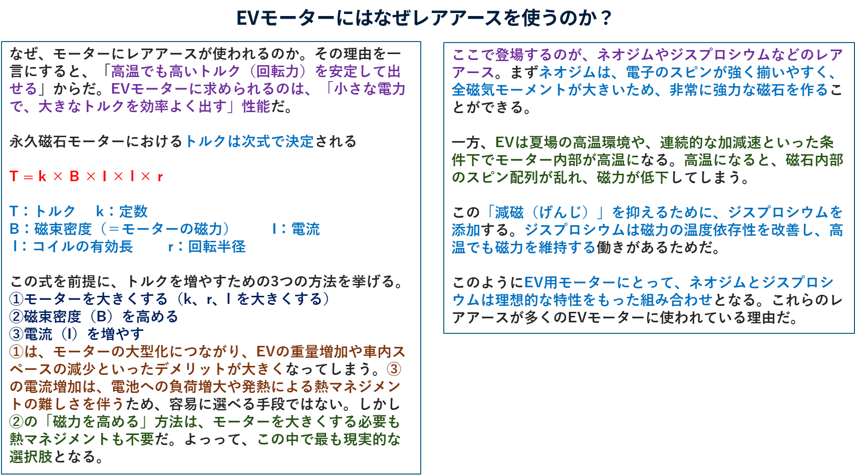 ここで重希土類フリーと書かれていますが、これは希土類の17元素のうち、スカンジウム(Sc)、イットリウム(Y)とランタノイドのうちランタン(La)からユウロピウム(Eu)までの7元素を軽希土類、ガドリウム(Gd)からルテニウム(Lu)までを重希土類と定義されています。ネオジム(Nd)とサマリウム(Sm)は軽希土類、ジスプロシウム(Dy)は重希土類になります。重希土類は軽希土類に比べさらに希少性が高いとされています。