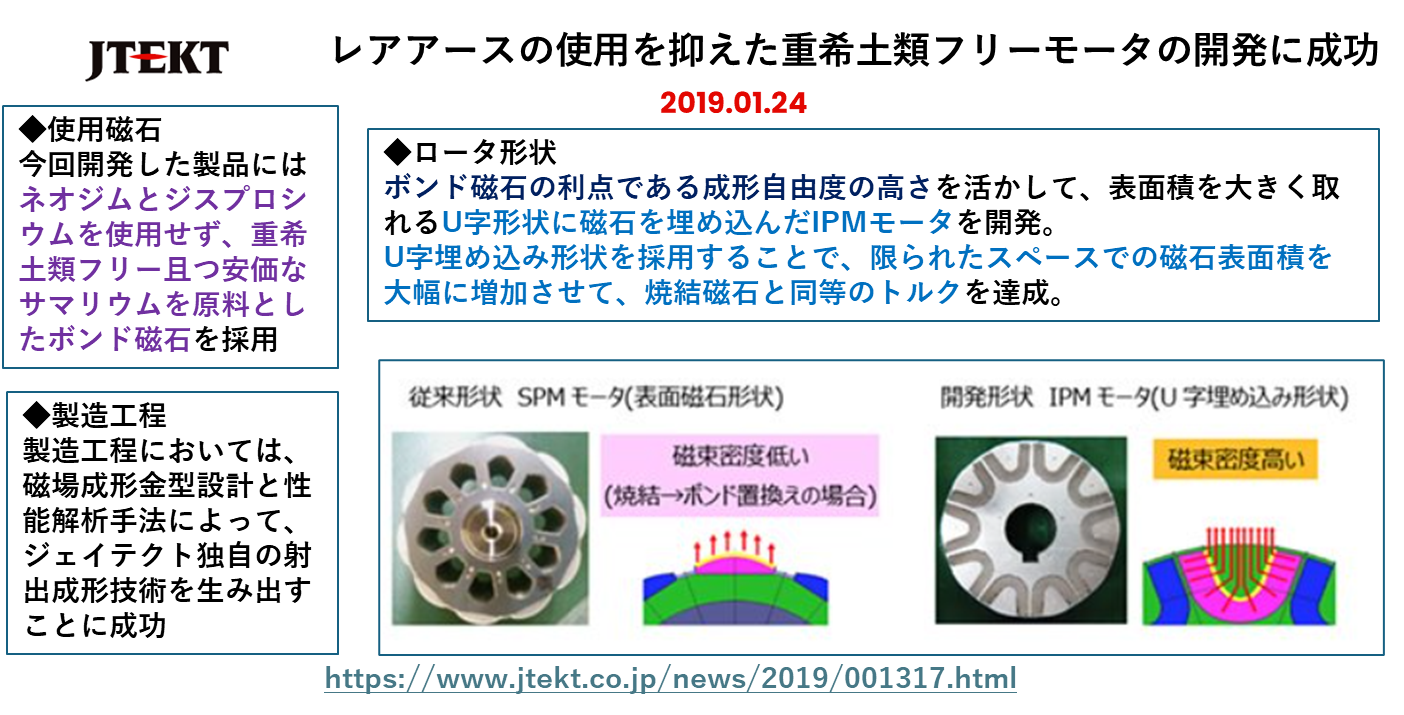 最初はネオジム、ジスプロシウムを使用しない(軽希土類のサマリウムは使用)モーターで、プラスチックやゴムなどに磁石微粒子を練り込んだボンド磁石を利用し、表面積を大きくできるU字状に磁石を埋め込んだIPMモーター(回転子内部に磁石を埋め込んだモーター)です。自動車関連部品を製造しているJtektが2019年に発表しています。ただし、その後の情報は特にありませんでした。
