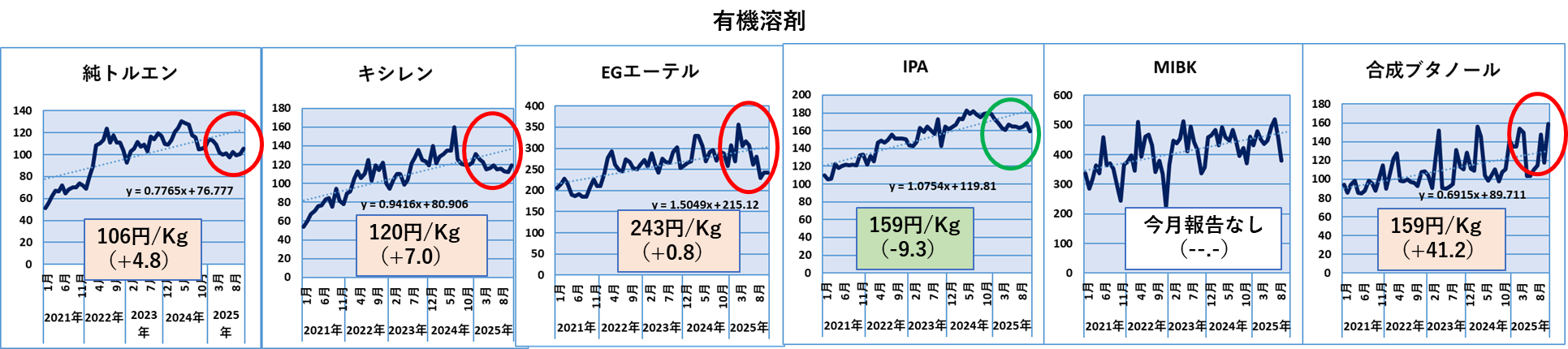 有機溶剤では前月から3%以上単価が上昇したのが、トルエン、キシレン、合成ブタノール、3%以上単価が下落したのがイソプロピルアルコールでした。