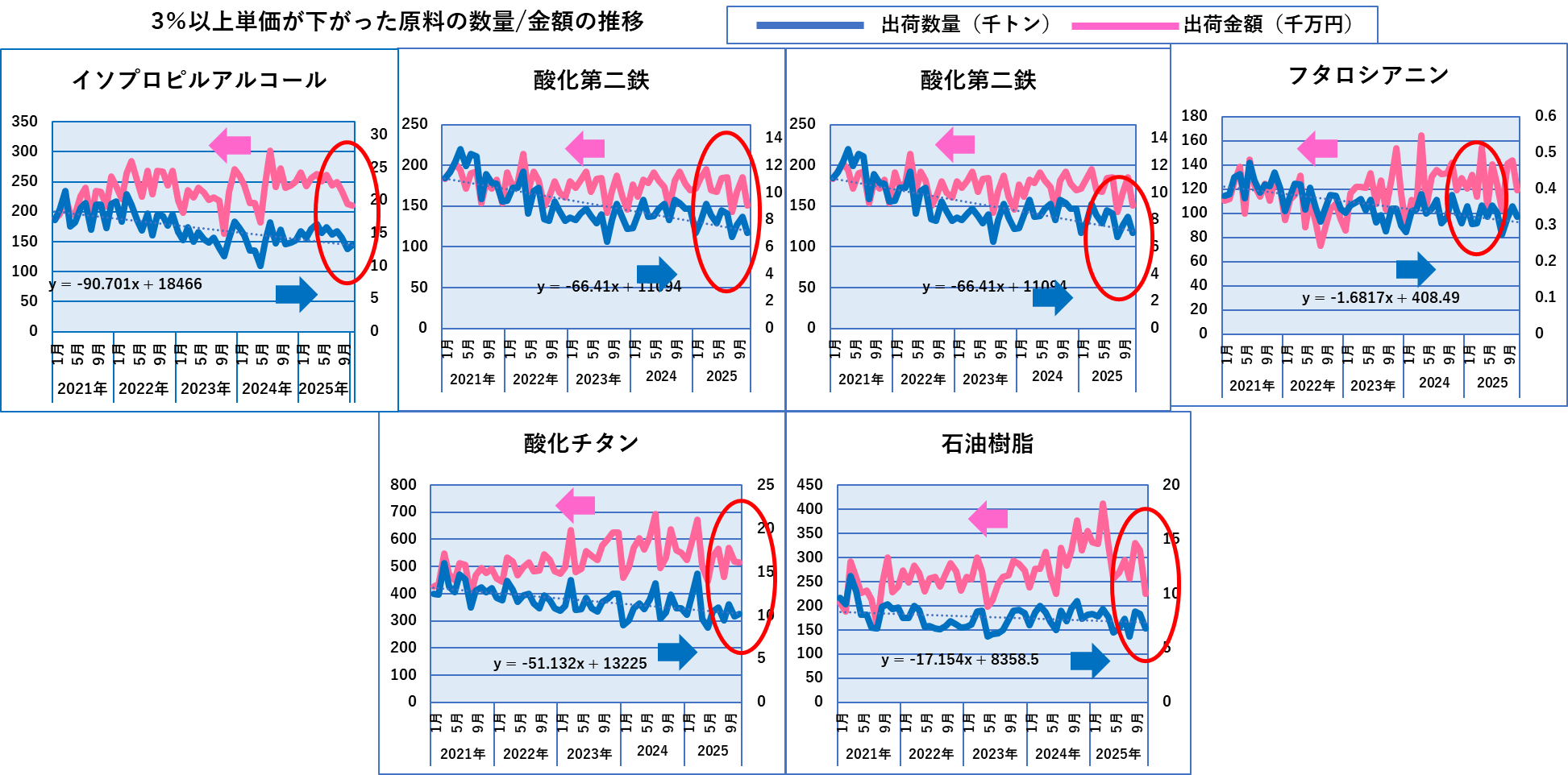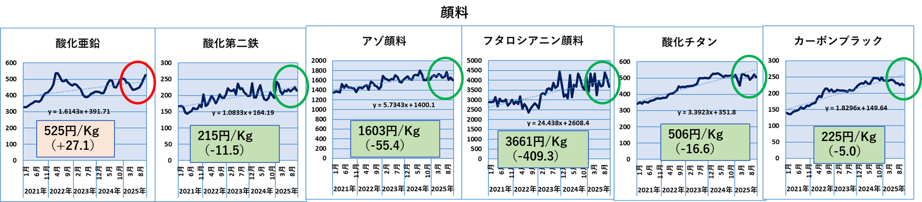 顔料では3%以上の単価上昇が酸化亜鉛、3%以上の単価下落がアゾ、フタロシアニン、二酸化チタンでした。