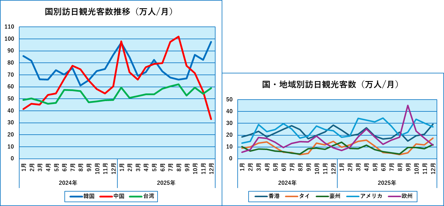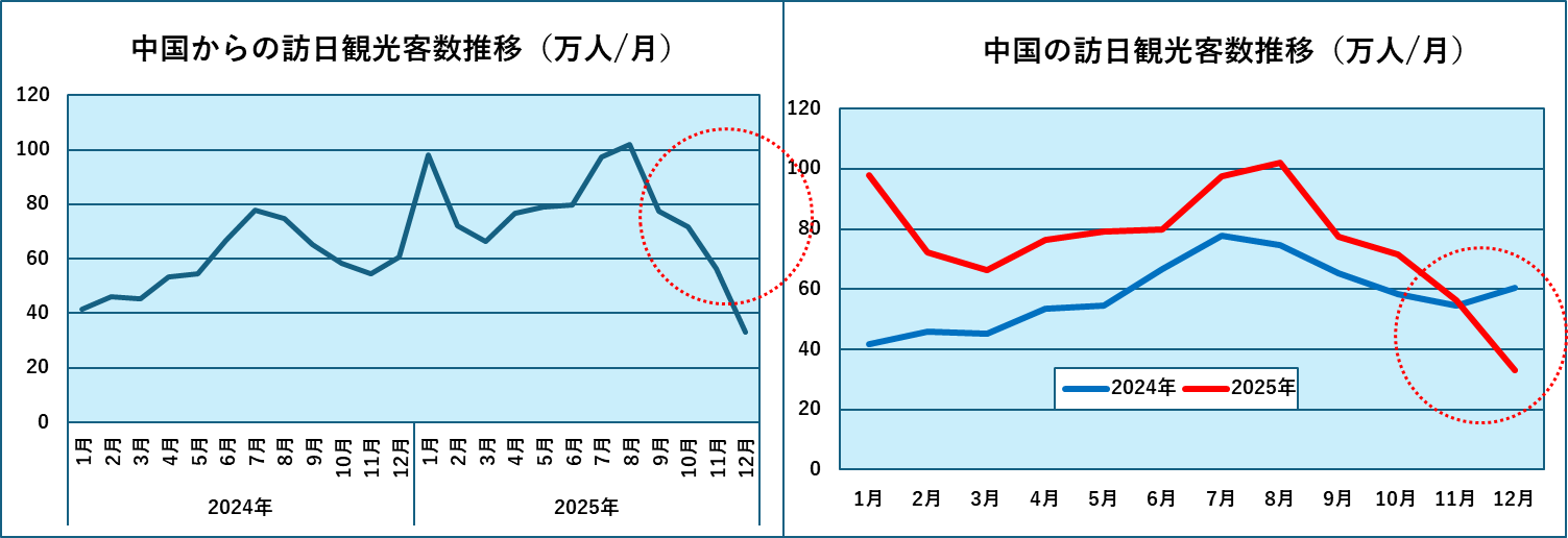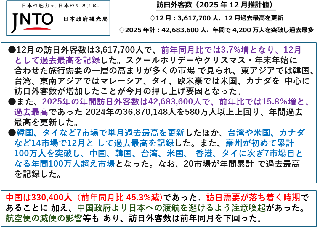 ただし、中国からの訪日客だけを見るとさすがに2025年8月以降減少が続いており、11月以降はさらに減少に拍車がかかったように見えます。2025年単月での来訪者が最多であった8月から見れば12月は3割ほどに減少したことんになります。団体客の訪日は早くても3月まではないと言われていますで、さらに減少する可能性もあります。