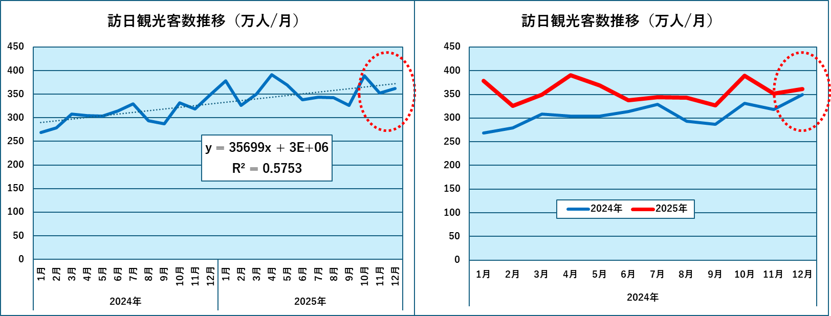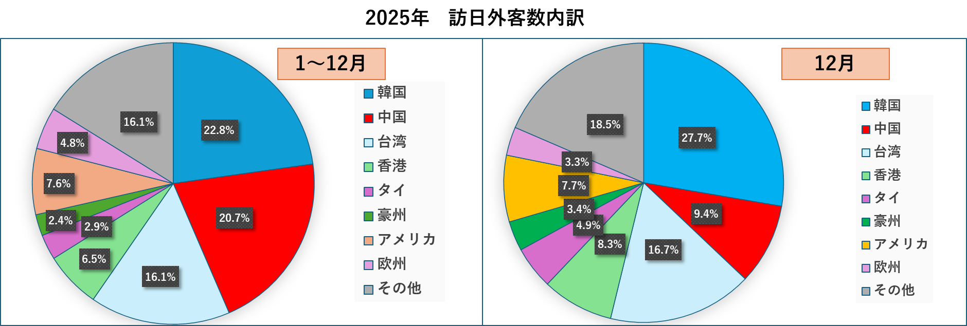 訪日客全体として、12月としても2025年としても過去最高であり、年間では初めて4000万人を超えました。11月以降の中国人客の減少の影響はグラフからは感じられません。昨年と同じ月どうしを比較した下右図からも11月以降の減少というのは感じ取れません。(下図)