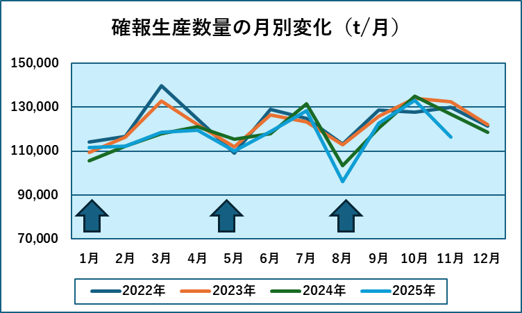 まず、前年同月と土日祝日数がどうなっているかを調べました。ただし、1月、5月、8月は除外しました。理由はそれぞれの月に長期が休暇が設定される場合が多いのではないかと思ったからです。1月の正月休み、5月の連休、8月の夏季休暇です。この3カ月は例年、他の月に比べて明らかに生産量が少なくなっています(下図参照)ので、おそらく普通の月とは異なる休日設定がされているものと思われます。