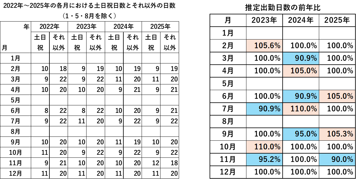 上右表で色付けしたのが、推定出勤日数が前年と同じでない場合です。各年とも9月中3~5カ月が前年と同じではありませんでした。しかも前年同月%を計算すると1日違うと約5%、2日では約10%前年比が変動します。