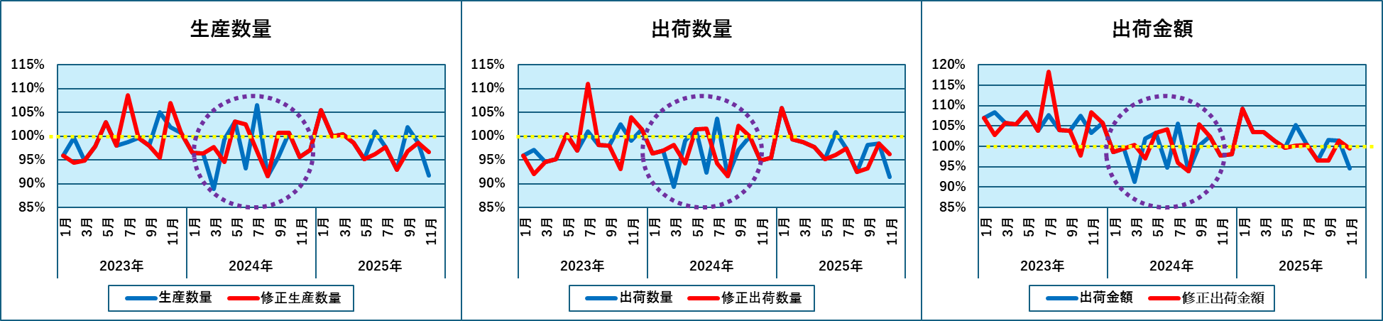 結果はこのようになりました。確報値との差について特に問題だと思われるのは2023年7月、10月、2024年6月、9月、2025年6月です。これらの月では、出勤日数が同じだとして計算する(これは推定出勤日一日あたりの生産量、出荷量、出荷額を計算することと同じ意味です)と確報値が前年比プラスであったものがマイナスに、マイナスであったものがプラスになってしまいます。そこまでいかなくとも2024年3月などは、確報における生産数量前年比が88.9%と絶不調ですが、出勤日数を同じにして計算すると97.8%となりさほどでもないことになります。2023年~2025年の中で、特に2024年は3月、4月、6月、7月、9月と年の中ごろに集中して推定出勤日数が前年と異なる月が並んでいたため、推定出勤日数を一緒にして計算した場合の数値とかなり違った推移になっています。(上図紫色の点線で囲った部分)