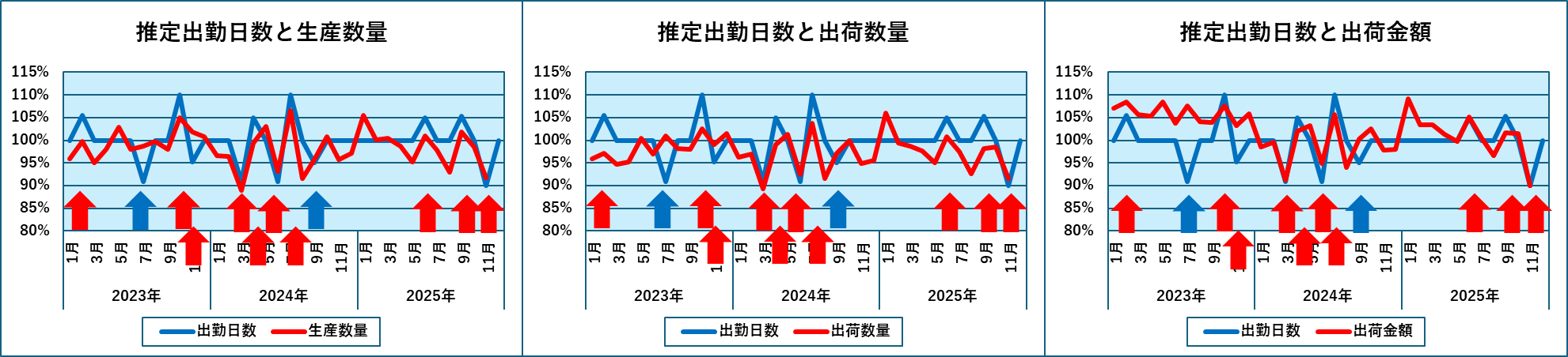 1月5月8月については推定出勤日数をすべて100%としてグラフを描きました。図中に矢印は、推定出勤日数と生産数量、出荷数量、出荷金額が、同じ方向に変化しているかどうかで色分けしたもので、赤は推定出勤日数と確報数値の前年同月比が同じ方向に動いている場合を、青は異なる方向に動いている方向に動いていることを示しています。推定出勤日数の前年比が多い月は生産数量、出荷数量、出荷金額の前年比も大きいことが多く、逆に推定出勤日数の少ない時はそうした数値の前年比が小さいことが多いということです。