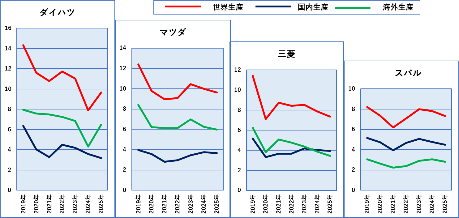 前年比で100%を超えたのは、トヨタ、ダイハツの国内と世界、スズキの世界生産だけでした。本ブログでは2019年以降のデータを手元で集計していますので、2019年~2025年の各社の国内、海外、世界生産の推移をご覧ください。2019年から2020年にかけてのコロナの落ち込みは全社共通ですが、それ以降の推移は会社によってかなり異なっています。上の4社の図、下の4社の図はそれぞれの中での縦軸は同じですので、見た目がそのまま台数の推移となります。ただし、上の4社の縦軸と下の4社の縦軸は異なっていますのでご注意ください。