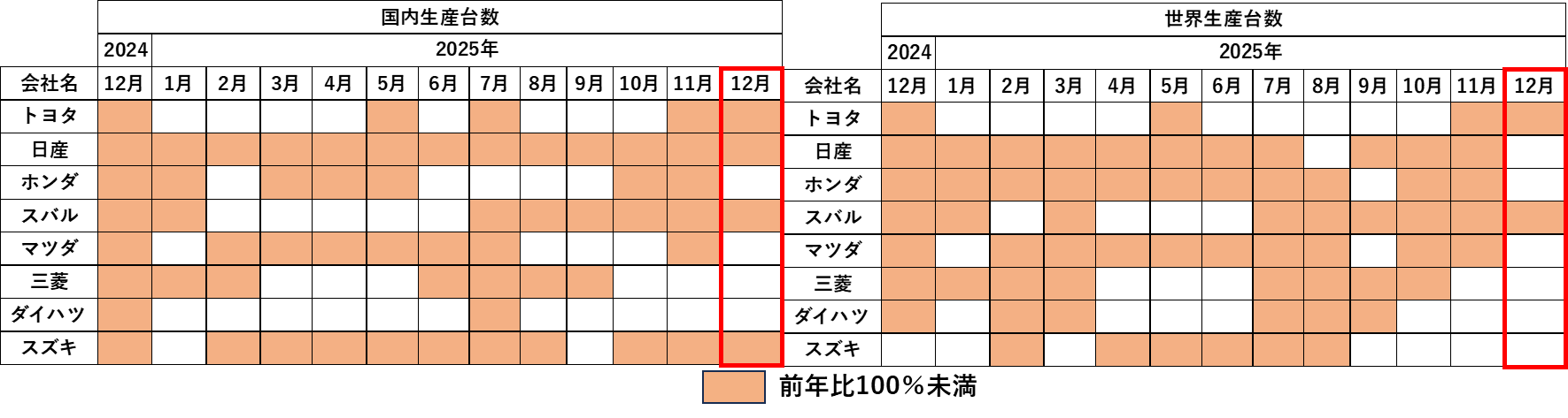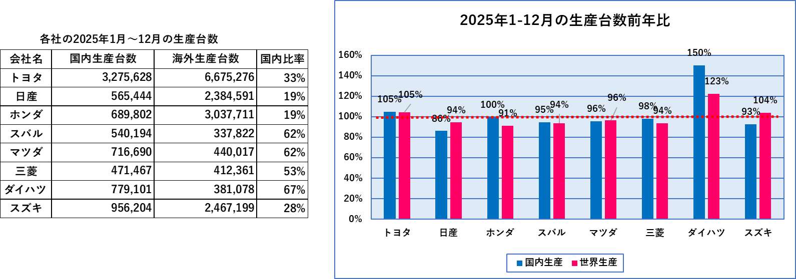 昨日、日系自動車メーカーから2025年12月及び2025年1月~12月のの生産台数の発表がありました。2025年は自動車製造業にとってはなかなか厳しい年でしたが、年末にむけて少し上向いてきた感があり、12月は前年同月を上回った会社が国内生産に関しては4社、世界生産では6社となりました。前年同月を上回った会社が過半数を占めるのは2025年では初めてでした。