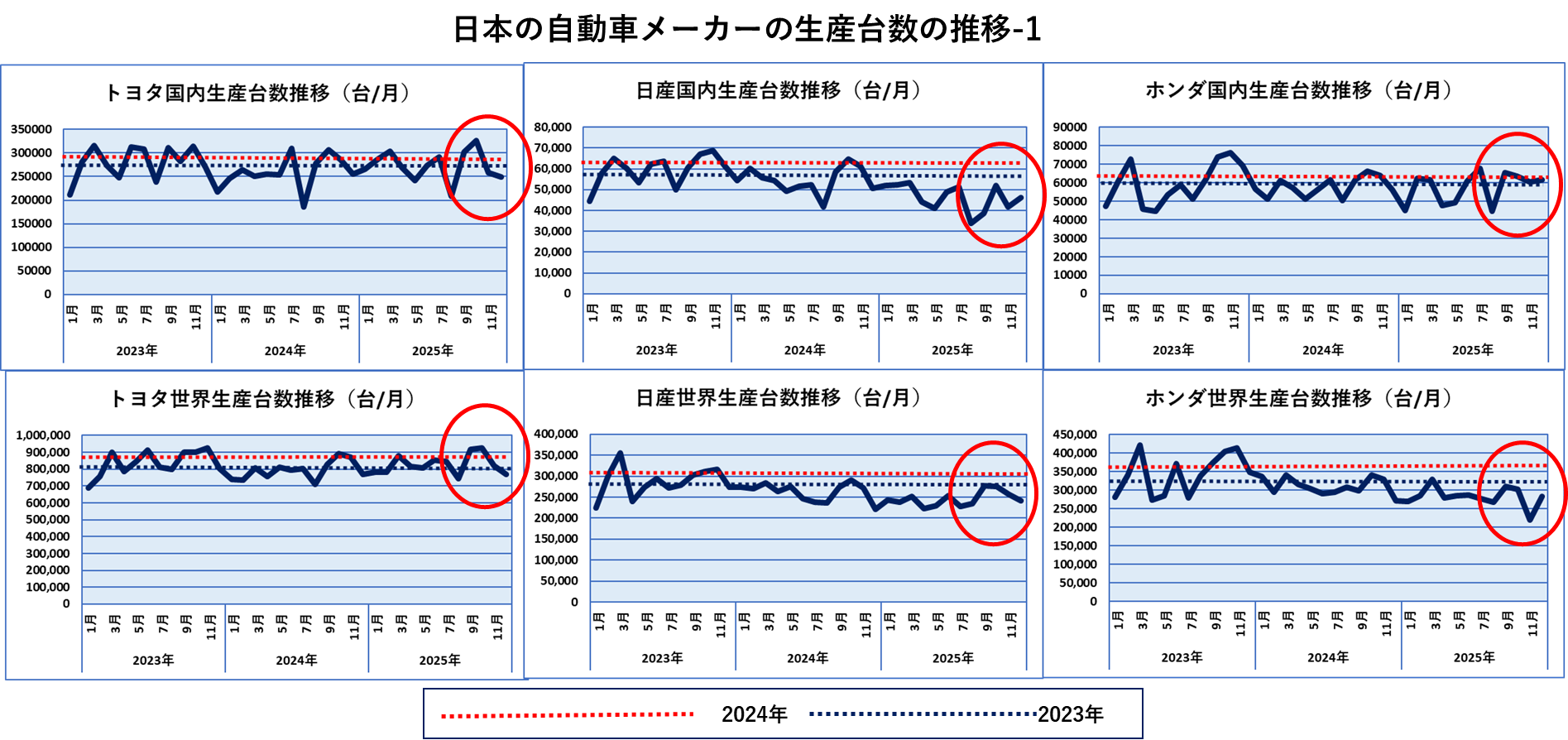 各図に2023年と2024年の月平均生産台数の線を入れていますが、上記3社の12月はほとんどそこには届かず、わずかにホンダの国内だけが2023年の月平均を上回りました。