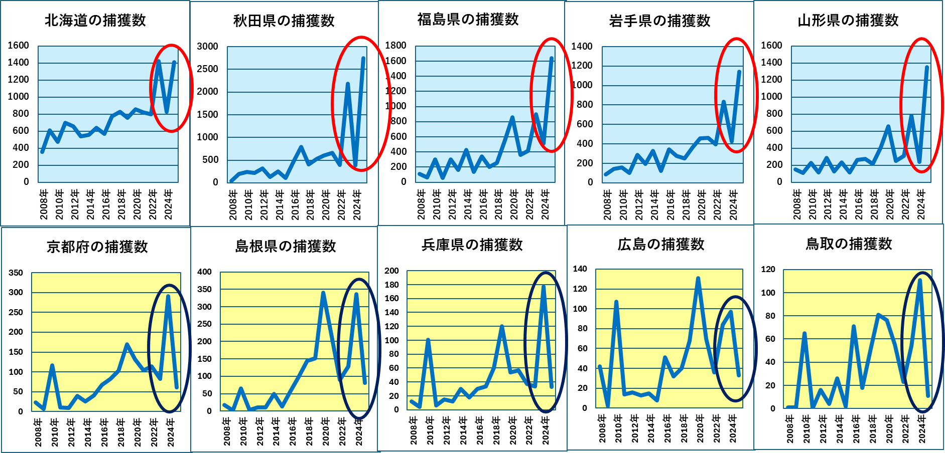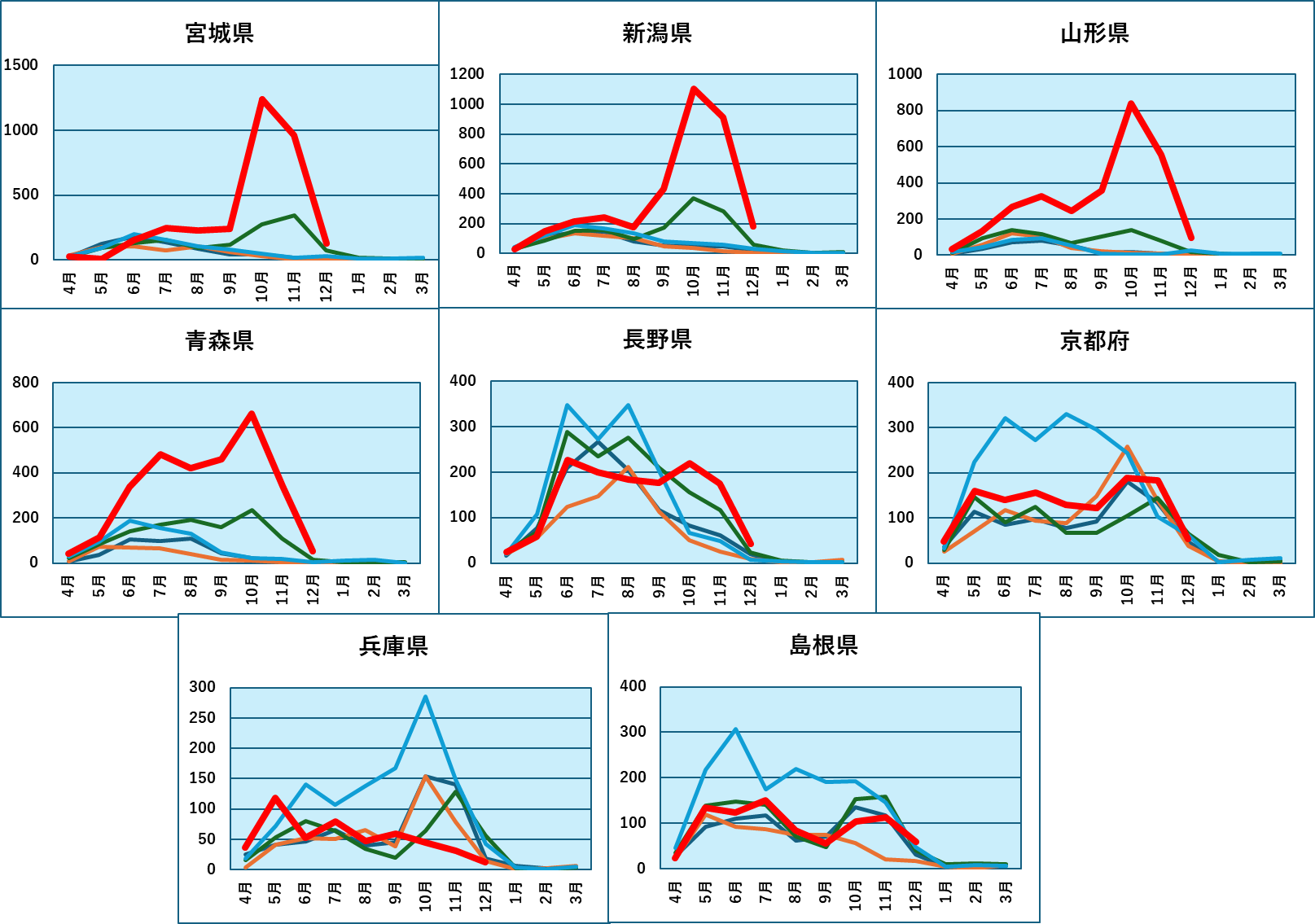 また都道府県別の捕獲数については、先月にご紹介したように、北日本と西日本では大きく傾向が異なっており、北日本ではとびぬけて最多であるのに対し、西日本(京都、島根、兵庫、広島、鳥取)では昨年から激減しており、こうした違いはエサとなるドングリ等の豊凶が要因ではないかと考えています。