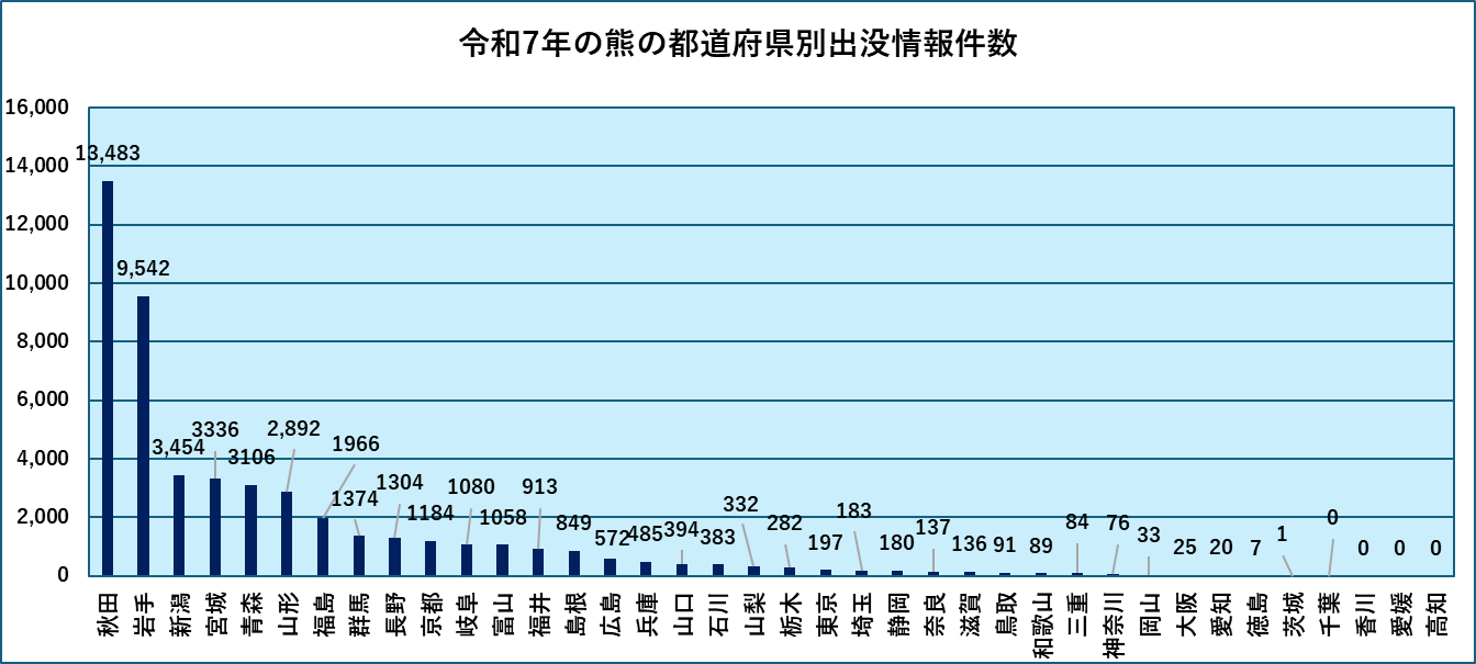 都道府県別の2025年度(令和7年度)の出没情報数は以下のようになっています。11月までの数字と大きくかわるところはありません。
