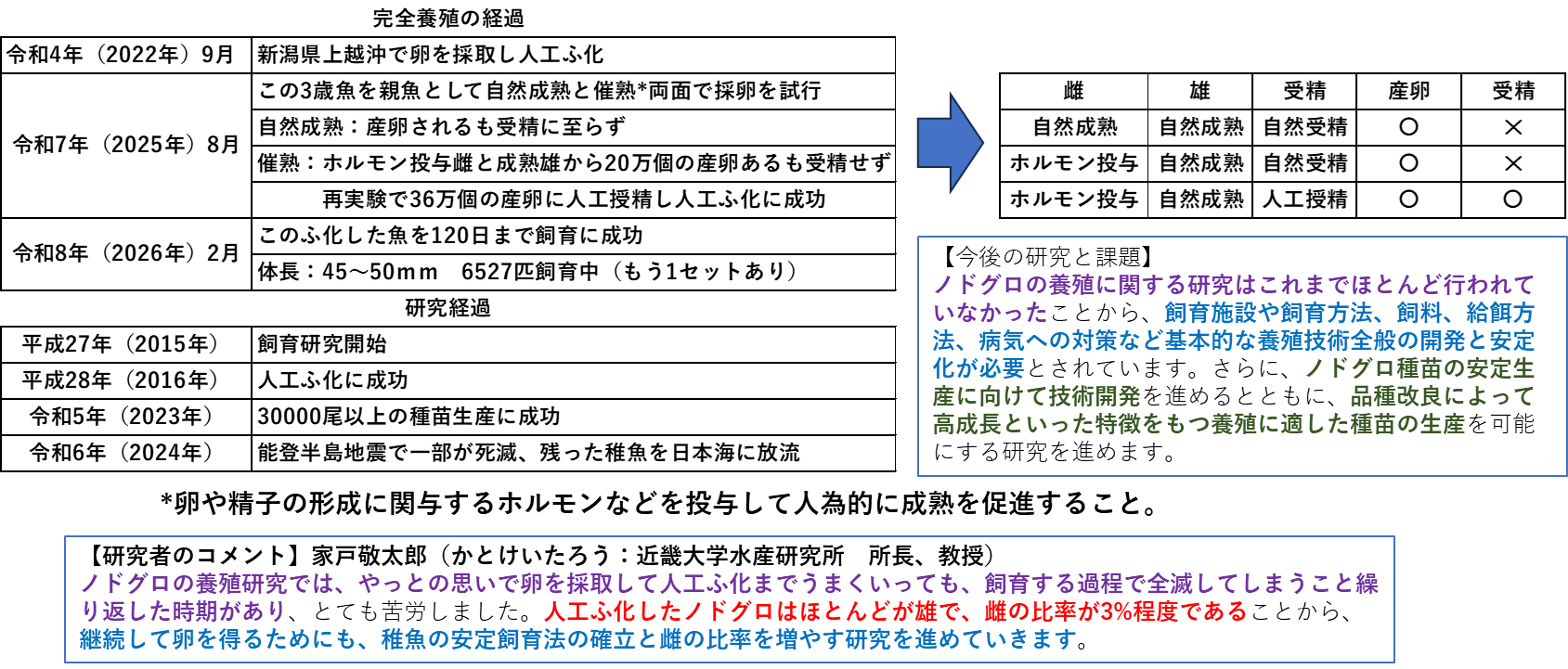 具体的には以下のように完全養殖化が進められました。下図左上の表をご覧ください。まず日本海で天然魚から採卵して人工ふ化し、それを3年間育成しました。昨年、この3歳魚を用いて自然またはホルモン投与により産卵させ、それを受精させる実験を行いました。ホルモン投与した雌を使用し、人工授精により受精卵が得られ、それをふ化させて120日ほど生育することに成功したのです。つまり卵から人工的に育成し、その魚が産卵した卵から魚を育成することに成功したということです。もちろん、いきなりこうした完全養殖が成功したわけではなく、その背後には飼育研究から始まって、段階的に進めてきた一連の研究があります。(下図右下の表参照)