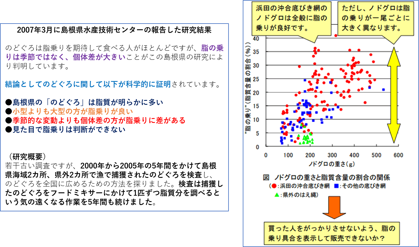食味においては、大変興味深いデータが紹介されていました。「のどぐろ」の食味については、「脂がのっていること」が重要な要因ですが、5年間にわたる膨大な調査の結果、脂ののり(脂肪分量)に関しては季節的要因よりも個体差が大きいことが判明したのです。巷で流布されている「のどぐろに季節なし」というのはあたっていることになります。(下図参照ください)