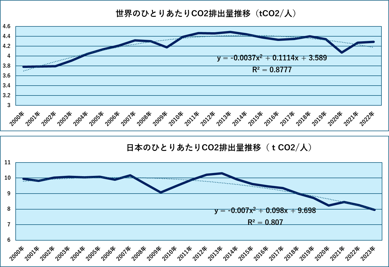 次にひとりあたり排出量の推移を示します。上が世界、下が日本です。