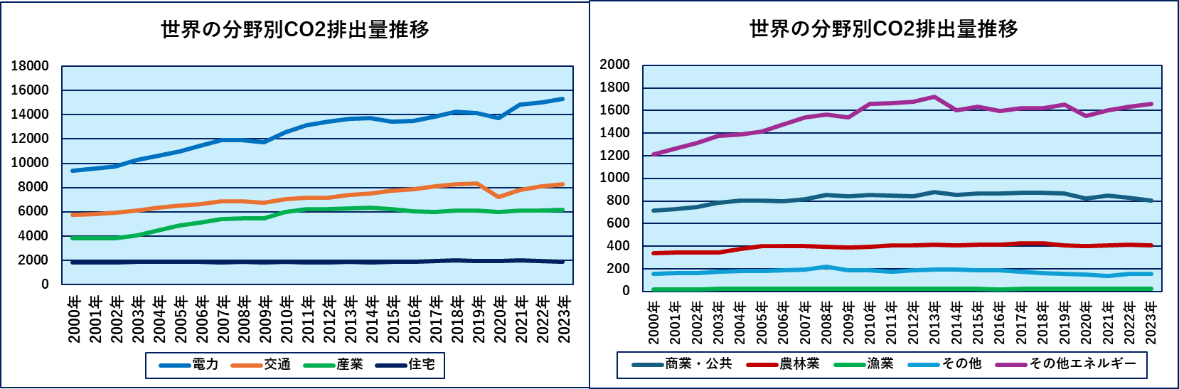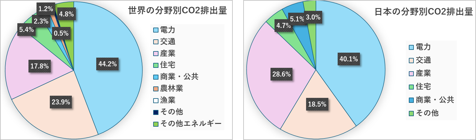 2023年における世界の分野別CO2排出量の内訳を下左図に、日本の内訳を下右図に示します。