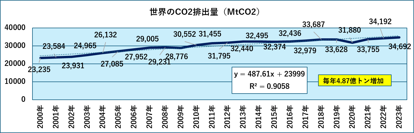 最初は世界の排出量の推移です。2020年~2023年にかけてのデータですが、残念ながら、まだ増加を継続しています。2023年では346億9200万トンのCO2が排出されており、一次回帰線からその増加率を求めると4.87億トン/年となります。