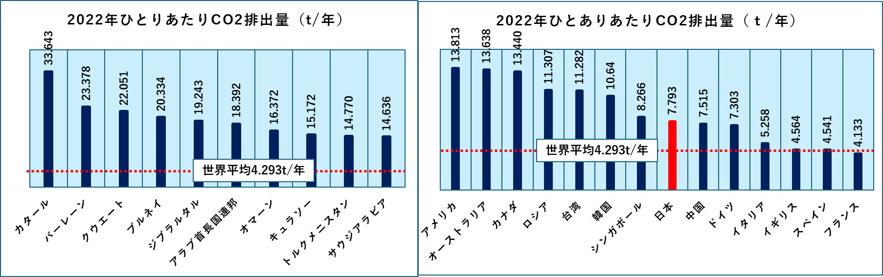 上左図はトップ10ですべて産油国、または天然ガス産出国です。右図は主要国でアメリカが12位、日本は23位となります。世界平均が4.293トン/年ですので、その2倍強の排出量になります。実は中国に比べても少し多い量であり、欧州各国から見るとかなり多い量となります。