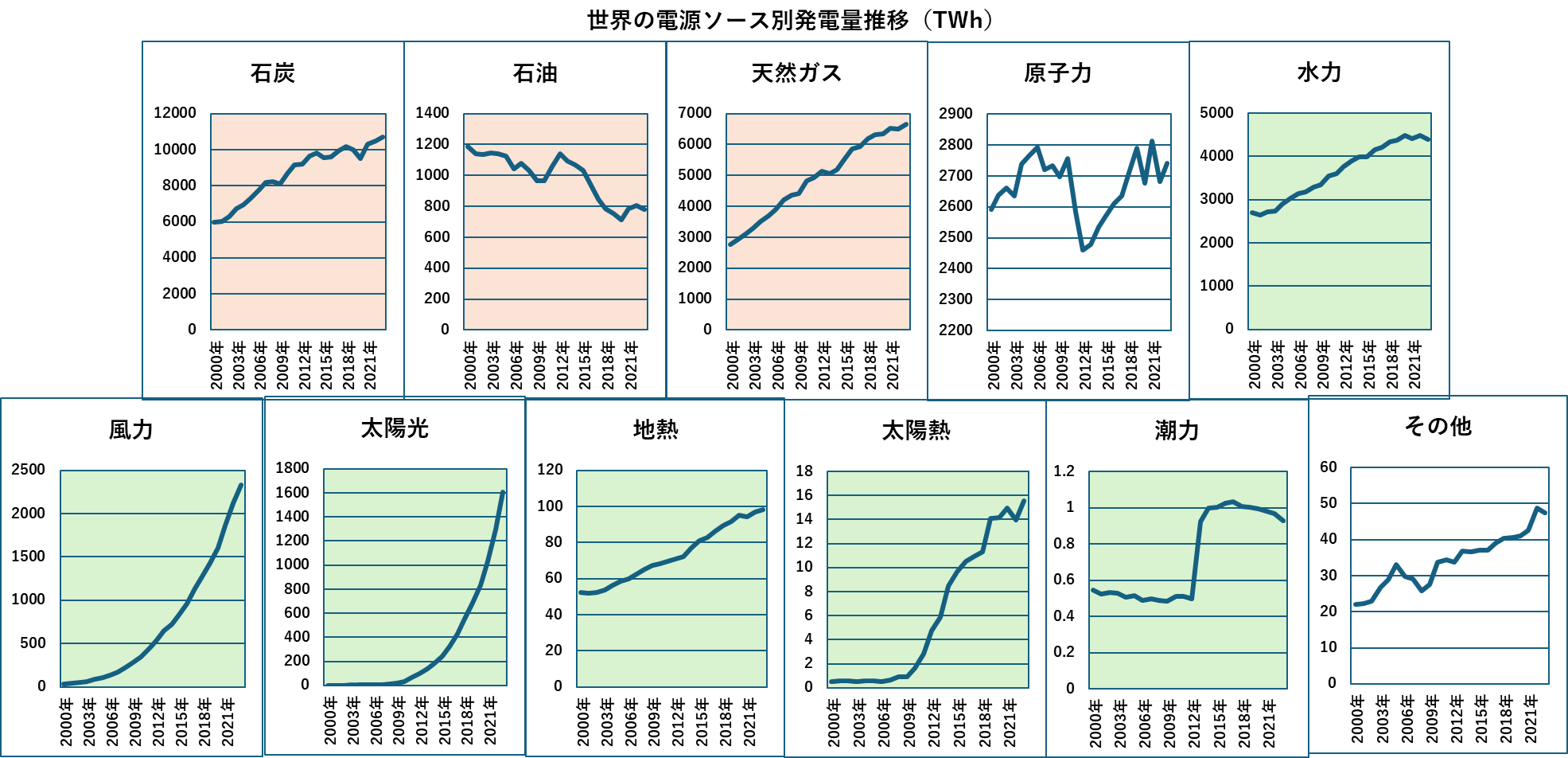 世界の電源ソース別発電量の推移を示します。石炭、石油、天然ガスが化石燃料です。水力、風力、太陽光、地熱、太陽熱、潮力が再生可能エネルギーです。原子力はCO2排出に関してはカーボンニュートラルです。石炭と水力には頭打ちの様相が見えます。風力、太陽光は急成長中で今後さらに拡大すると考えらられます。地熱も定常的に増加、天然ガスも化石燃料の中では安定に増加しています。石油は明らかに減少しました。