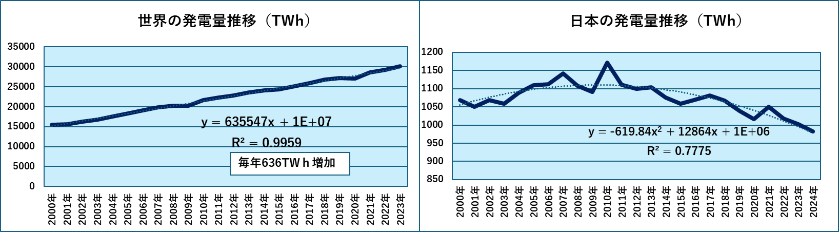 こちらも全体の発電量と同様で、世界は直線的に増加、日本は2010年以降減少が始まっています。