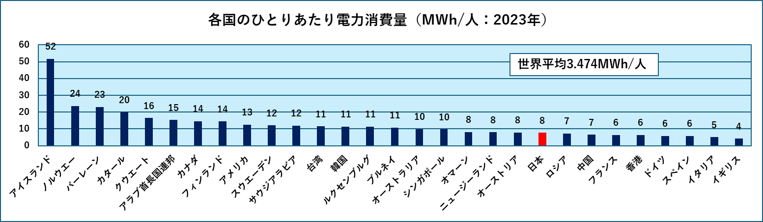 次に各国のひとりあたり電力消費量です。世界の平均は3.474MWh/人ですが、ここに掲げた国はすべてその平均値を上回っています。日本はおおよそ世界平均の2倍の電力量を使用しています。