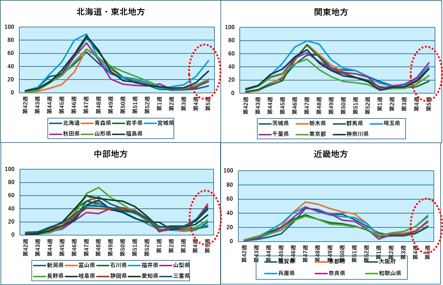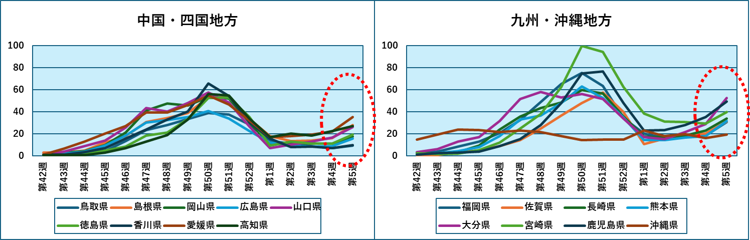 直近第5週の各都道府県の定点あたり感染者数では、九州がワン、ツーでしたが、その後宮城、山梨、千葉、静岡、三重、埼玉と続き、東北、関東、東海と地域がばらついています。九州(下図の黄色)は沖縄を除き、すべて全国平均を上回りました。