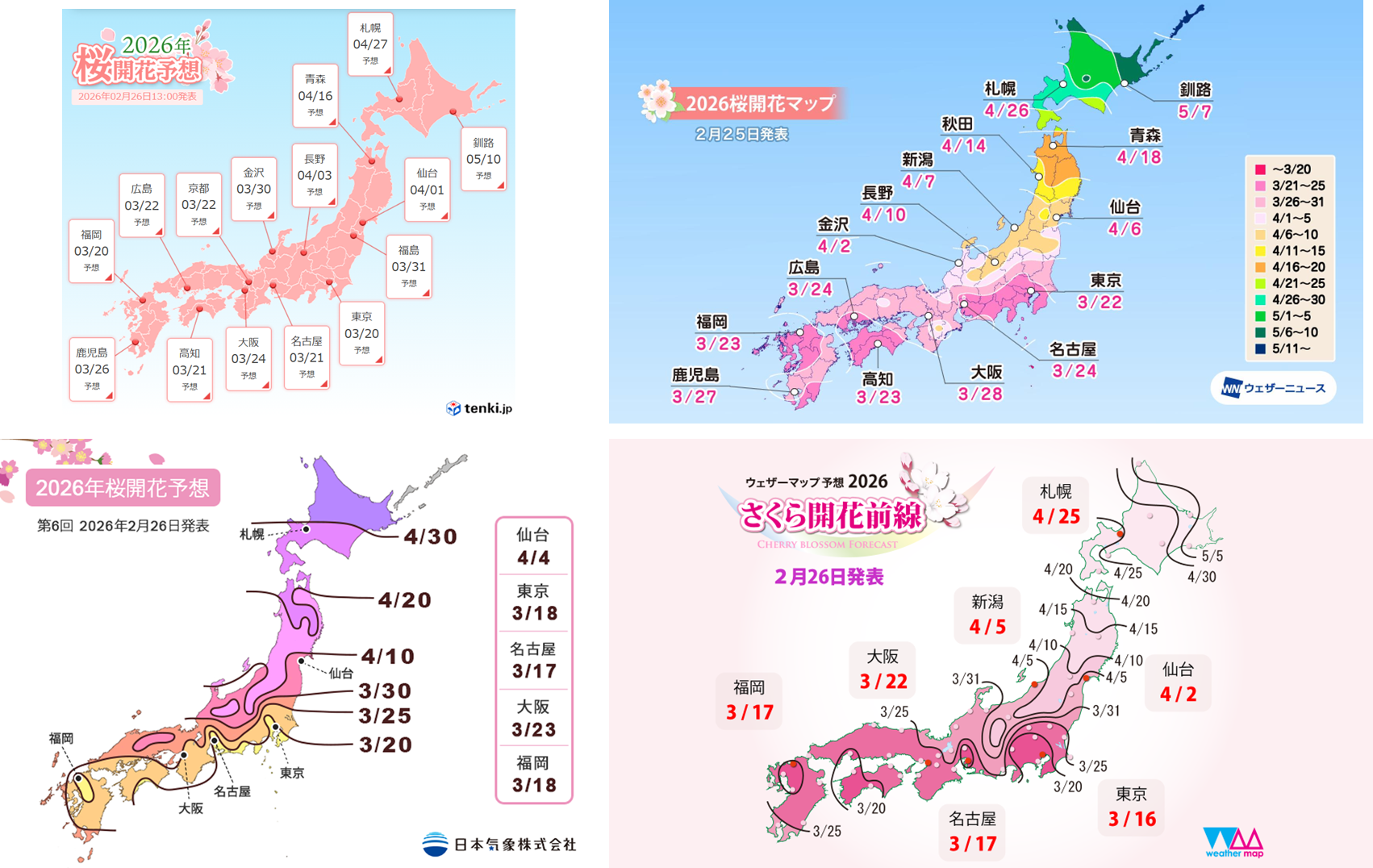 各社とも日本地図に開花前線and/or主要都市の開花予想日を表示するスタイルをとっています。(下図:左上から右下へかけて日本気象協会、ウエザーニュース社、日本気象株式会社、ウエザーマップ社の順です)