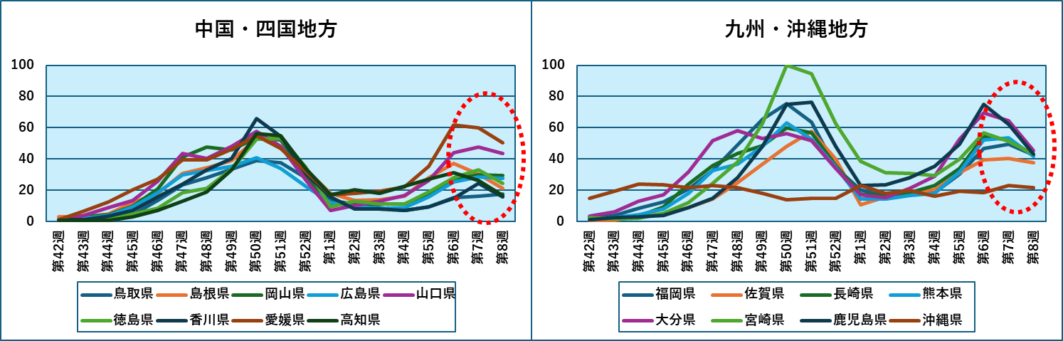 第8週における都道府県別感染者数では、これまで同様で九州各県と埼玉、山口、奈良などが上位にあります。