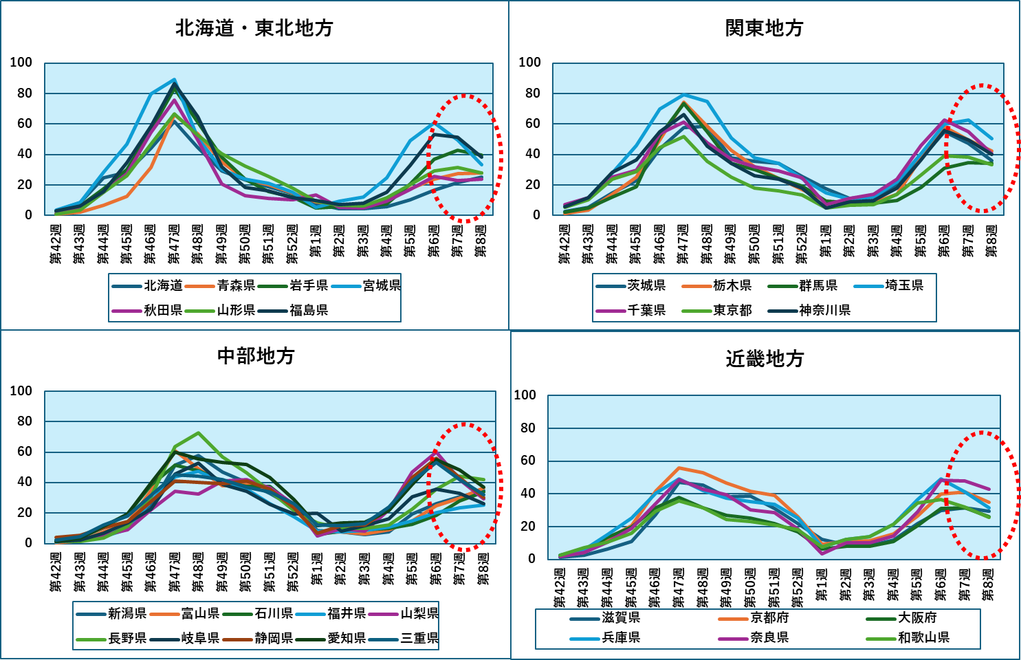 都道府県別の今シーズンの感染者数推移です。第7週から第8週にかけて増加したのは、北海道、新潟、富山、石川、福井の道県でした。