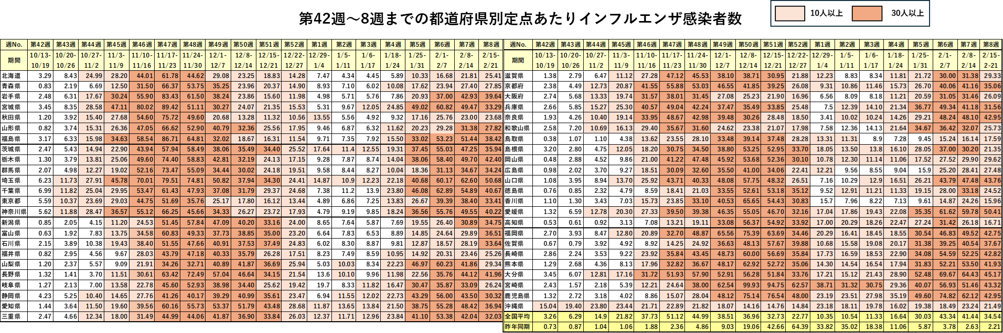 2月27日に厚労省から第8週のインフルエンザ定点あたり感染者数が発表になりました。すでにピークは過ぎているもののその減少の仕方は極めて緩徐です。今シーズンの都道府県別感染者推移一覧表をご覧ください。