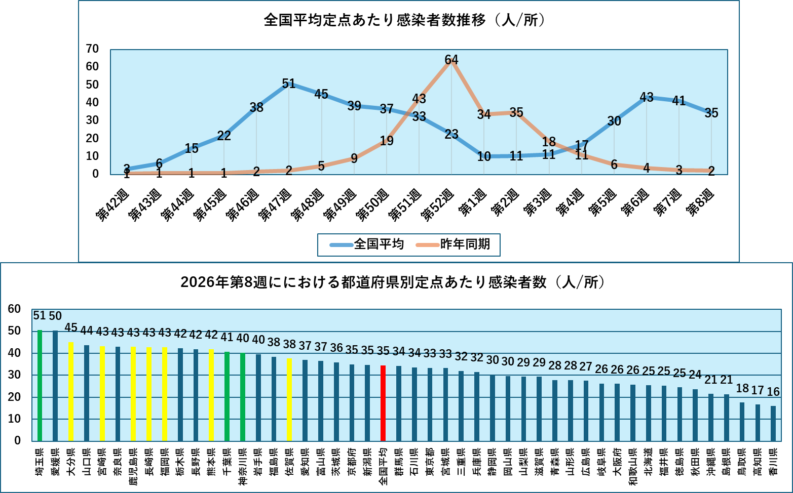 全国平均では、第6週にピークを迎えていますが、そこからの減り方がもどかしいほどゆっくりとしています。このままでは、定点あたり感染者数が10人以下になるにはまだ少なくとも3-4週間かかると思われます。