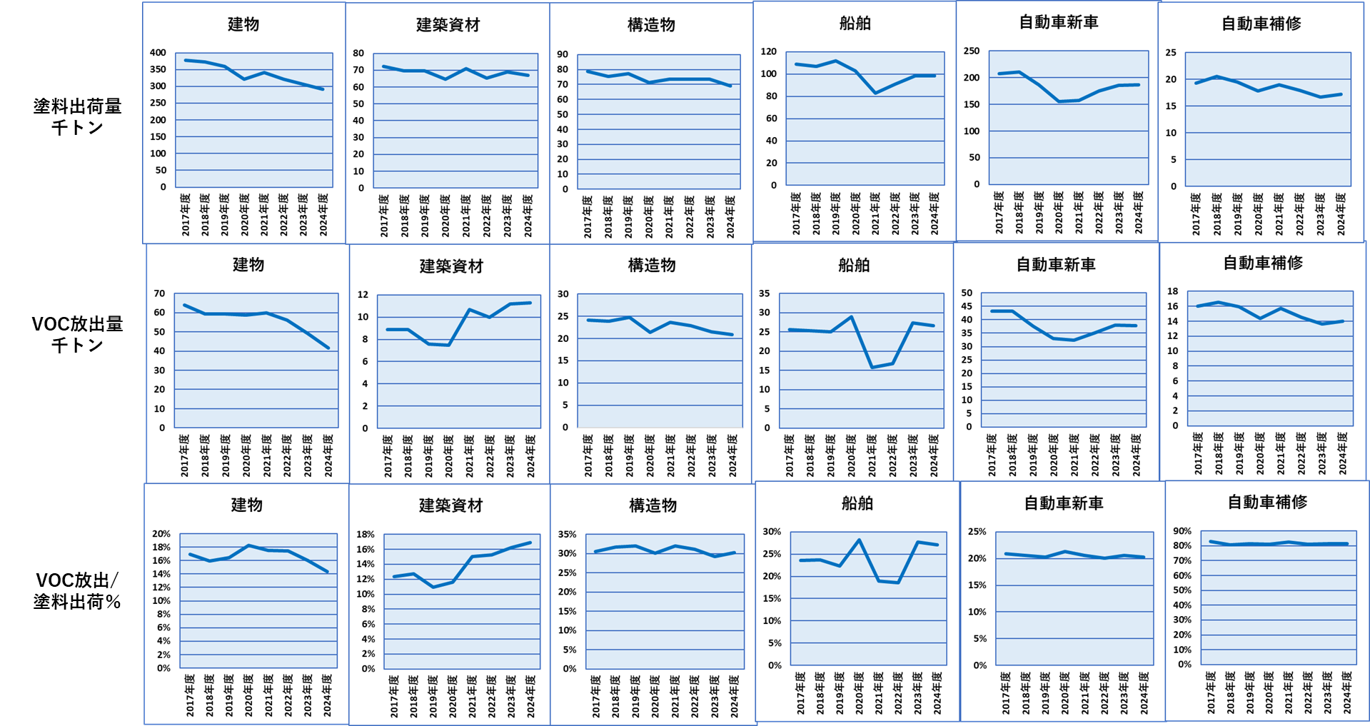 最初は需要分野別の①塗料出荷量、②VOC排出量、③VOC排出量/塗料出荷量%についての2017年年度から2024年度までの推移のグラフからご覧ください。①には希釈シンナーが含まれていません。 ②は希釈シンナーからのVOC排出量が含まれています。③は塗料出荷量に対するVOCの排出量%で、これが低いほど塗装時に排出されるVOCの割合が低いことになります。すなわち①はもちろん、②も出荷数量の増減の影響を受けますが、③は出荷数量の影響をうけないため、本当の意味でのVOCの増減がわかる数値となっています。