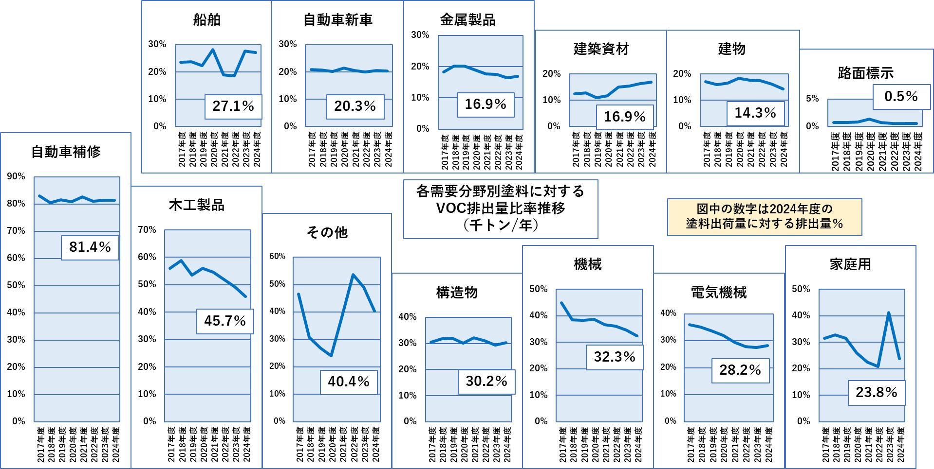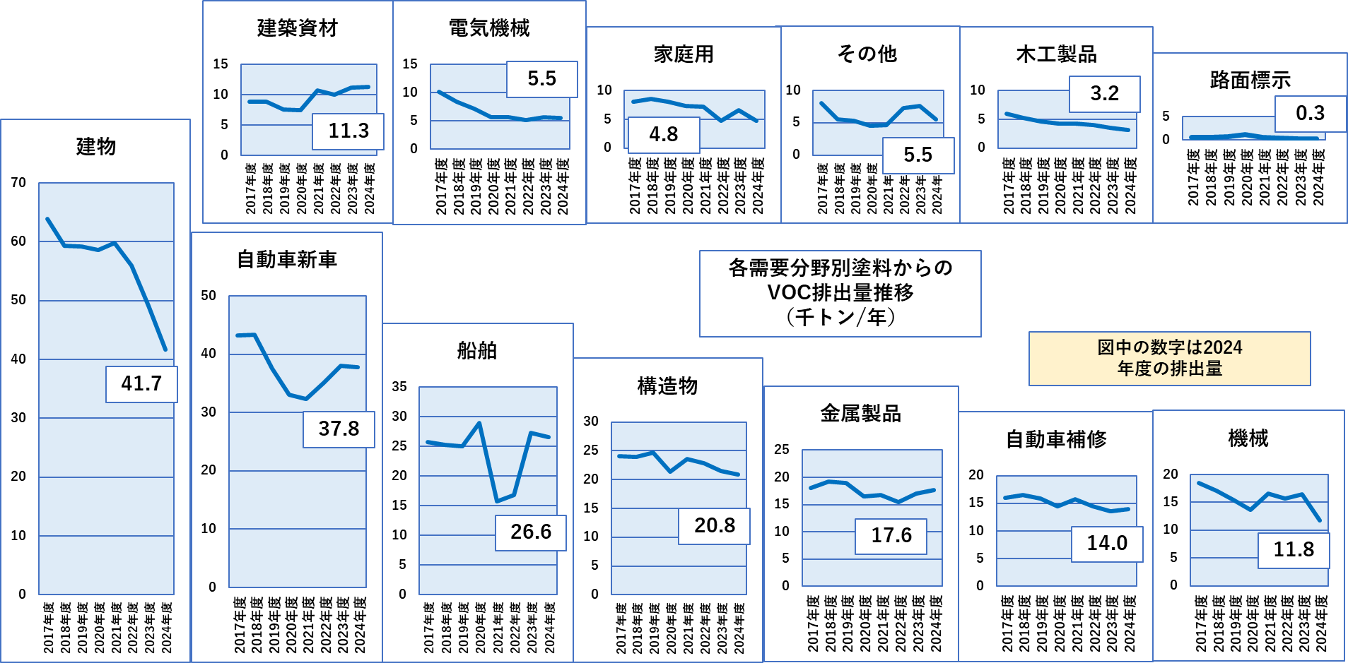 最下段に着目するとこの6分野では建物(建築)がわずかにVOCの放出が減少傾向ですが、建築資材は明らかに増加傾向、構造物(防食)、船舶、自動車新車、自動車補修は増減なしと判断されます。