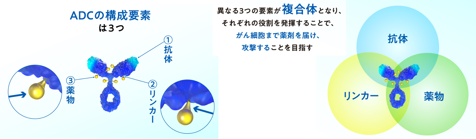 ADCの構成要素は3つであり、抗体と薬物、およびその両者を結びつけるリンカーと呼ばれる3つの部品から構成されています。この3つの部品はそれぞれ役割は決まっており、それぞれの役割を果たすことで薬剤をがん細胞まで届けてがん細胞を攻撃することが意図されています。