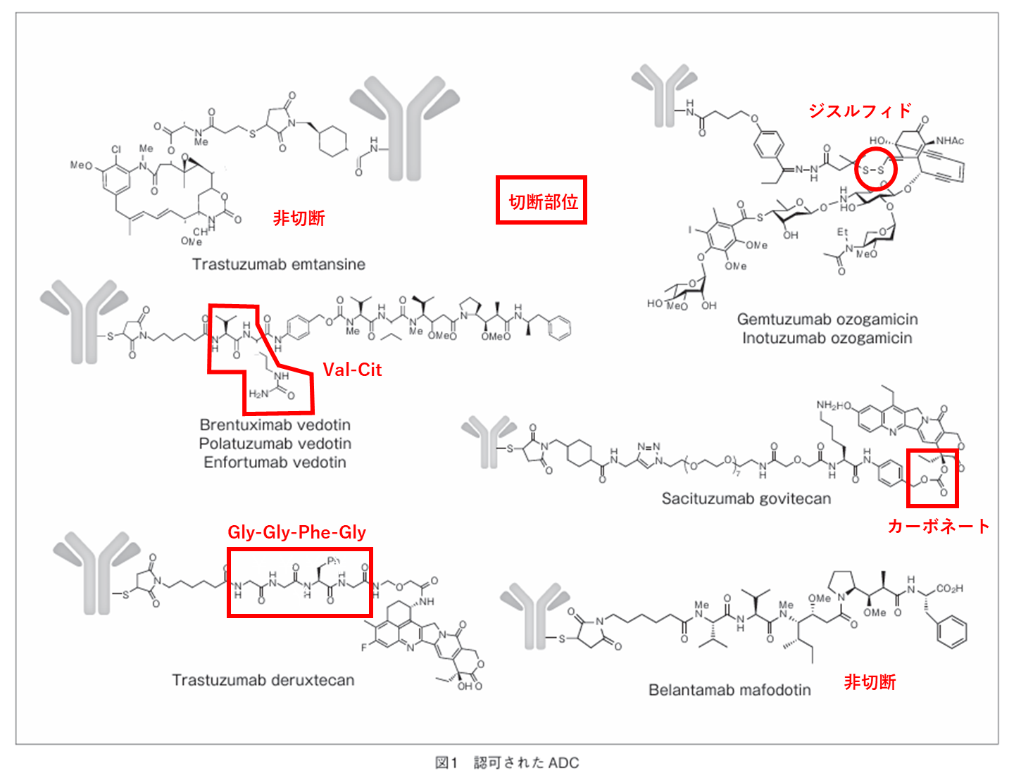 さらに詳しい認可済ADCの構造図もありましたので、切断部位を書き込んでみました。