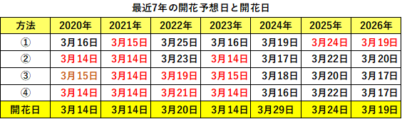 今年については、①式が的中、②が一日違い、③と④が2日違いとなりました。4本とも2日以内ですので、今年の開花式的中率はまずまずだったと言えるかもしれません。