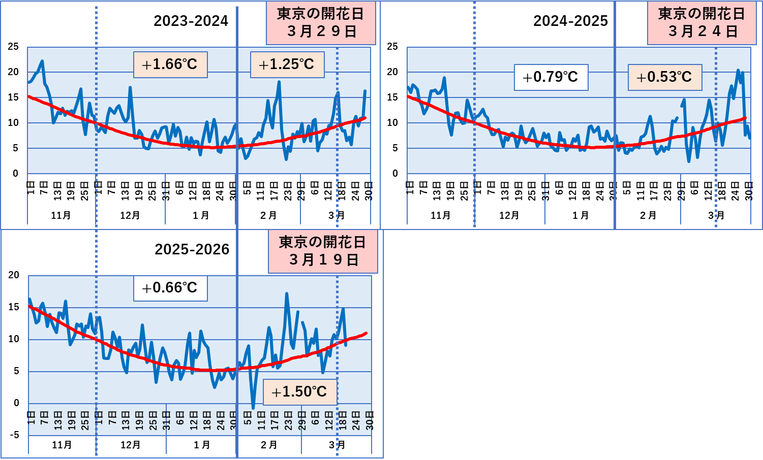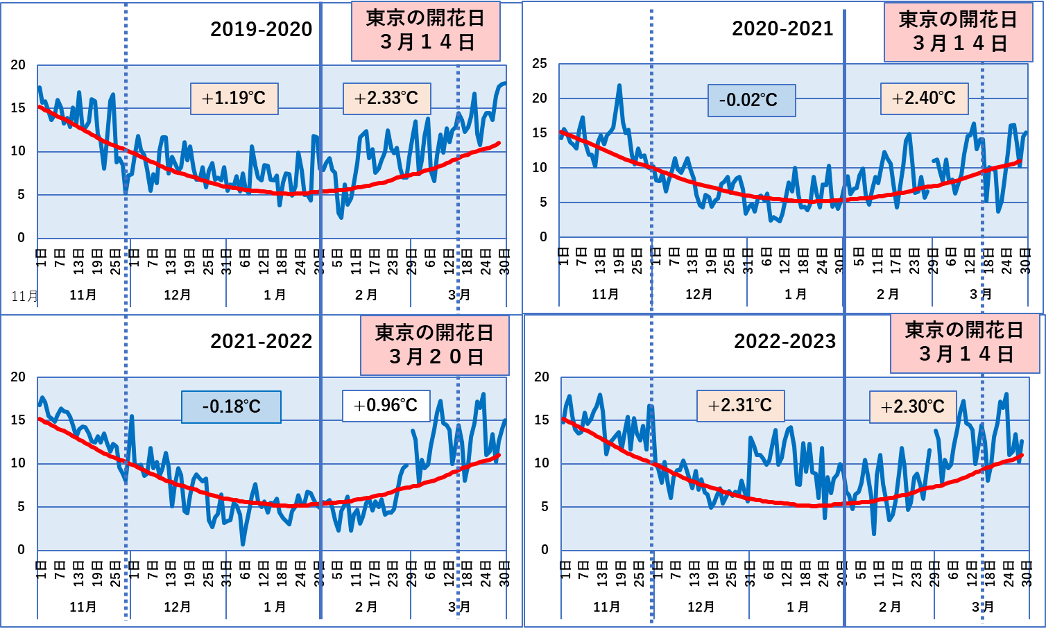 さて、この開花式の検証においては起算日を2月1日または2月4日としています。本来休眠打破の日についても、気象会社の開花予想では、各種気象情報から毎年独自に特定されているそうです。ともあれ、今年も昨年に引き続き、11月以降の気温の推移から何か開花日との関係がわからないかと考えてみました。