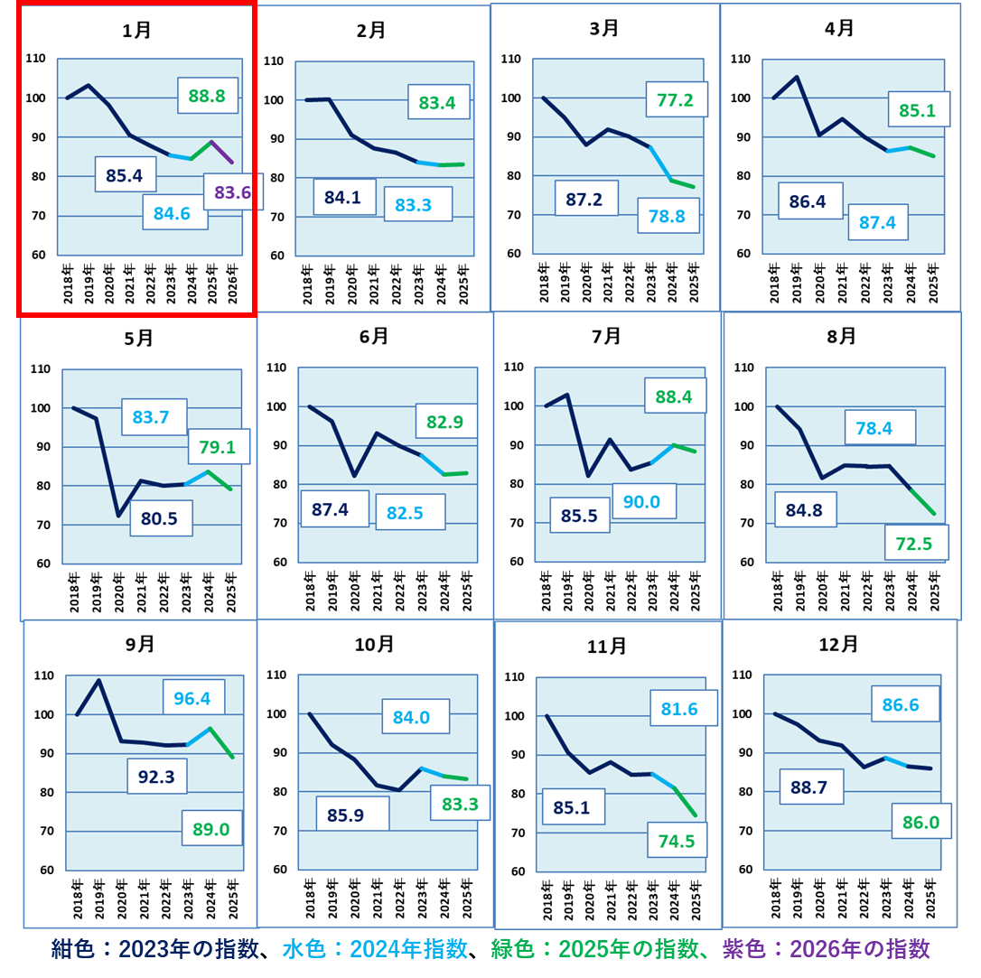 1月は純出棺の前年同月比が低かったため、前年の指数値からさらに下がりました。